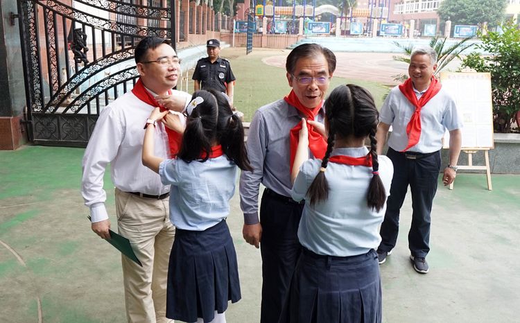 少先队大队干部为蔡校长、张院长系上鲜艳的红领巾。