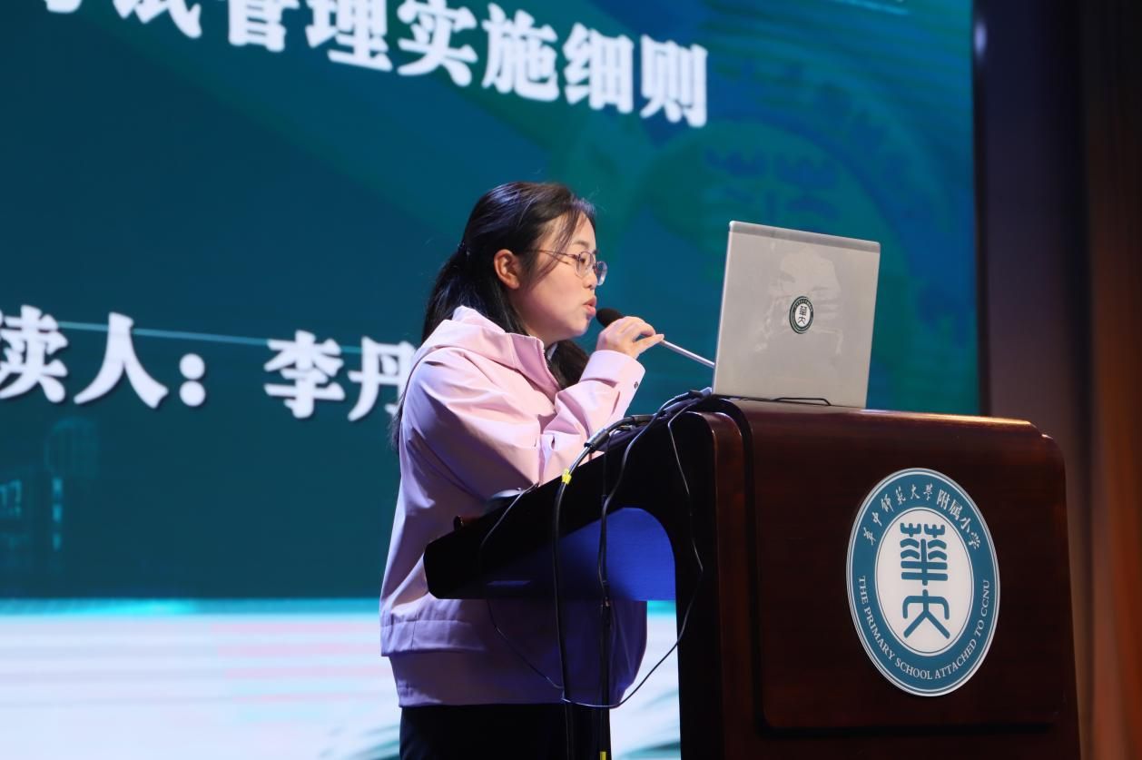 第四项议程,桂子山校区课程中心主任李丹解读《华中师范大学附属小学考试管理实施细则》。该细则围绕减负提质目标,明确考试管理职责划分、规范考试频次,规定一、二年级不开展纸笔考试,三至六年级每学期仅组织一次期末考试。此外,细则还对命题管理、考务实施及结果应用提出具体要求,明确考试实行等级评价,不排名、不公布,突出诊断与改进功能,为学校教学管理与育人工作提供制度保障。