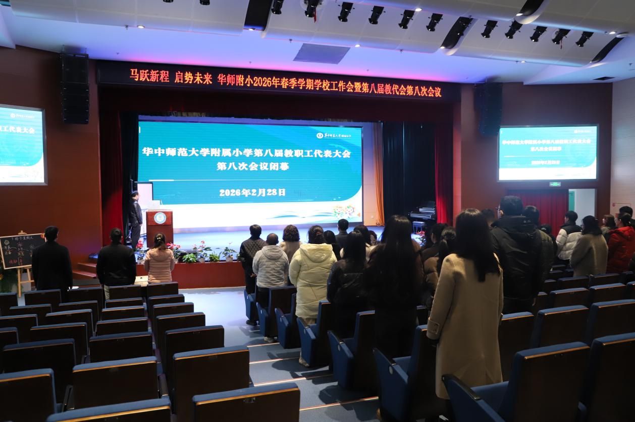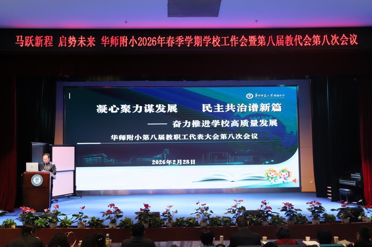2026年2月28日,华中师范大学附属小学第八届教职工代表大会第八次会议在该校报告厅召开。全校教职工代表齐聚一堂,共商办学发展大计,为新学期教育教学创新与学校高质量发展擘画蓝图,充分彰显民主办学、科学育人的坚定追求。