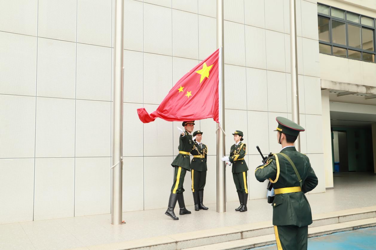 在雄壮的《义勇军进行曲》中,旗手振臂一挥,划出一道漂亮的弧线,鲜艳的五星红旗顺势展开。少先队员和国旗护卫队团员们同时敬礼,国旗在全体师生的庄严注目下冉冉升起,仪式热烈而隆重。