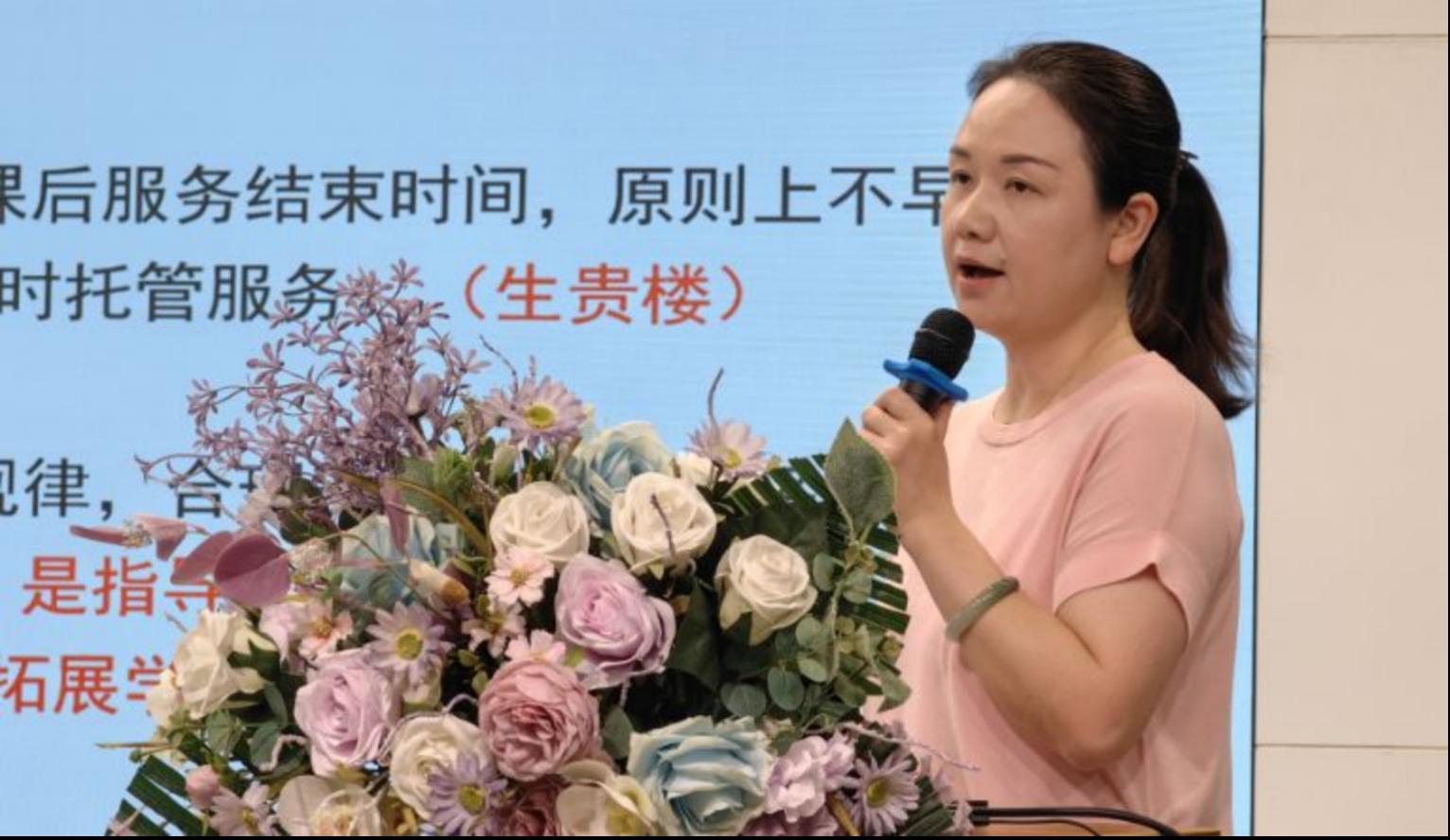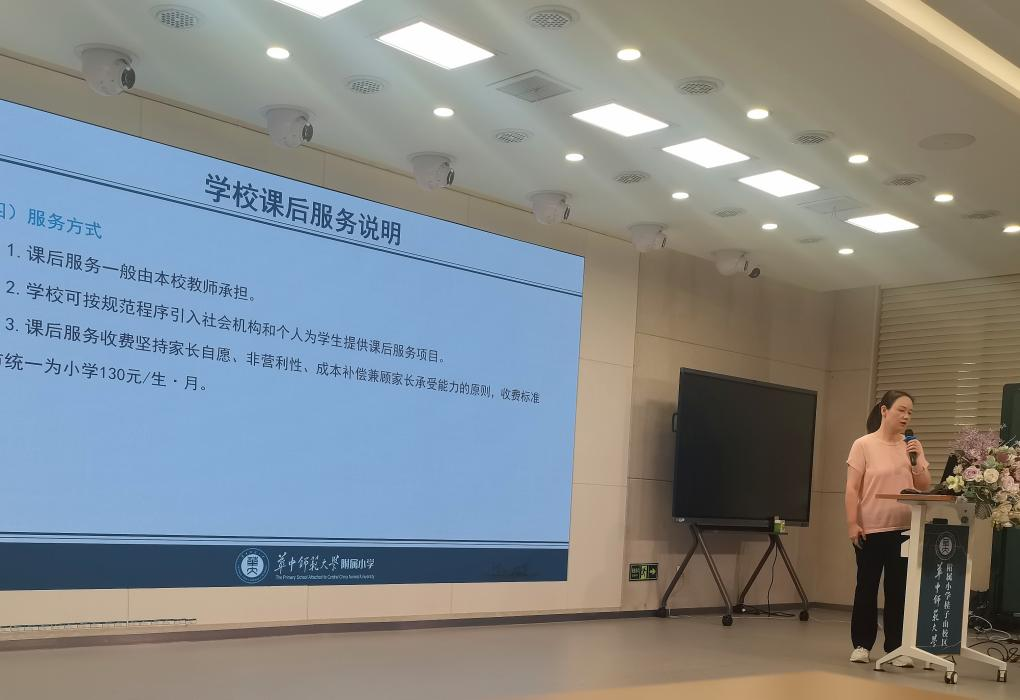 最后,学校办公室主任徐宇红对家长关心的课后托管和食堂管理工作进行了汇报说明。徐主任详细讲解了课后托管的实施背景、指导思想、工作原则、工作安排和服务方式;对学校食堂管理工作的日常模式、食堂满意度调查情况、针对存在的问题制定的整改方案等进行了介绍,帮助家长们更好地了解学校的管理工作,力争做到让学生开心、家长放心、学校安心。