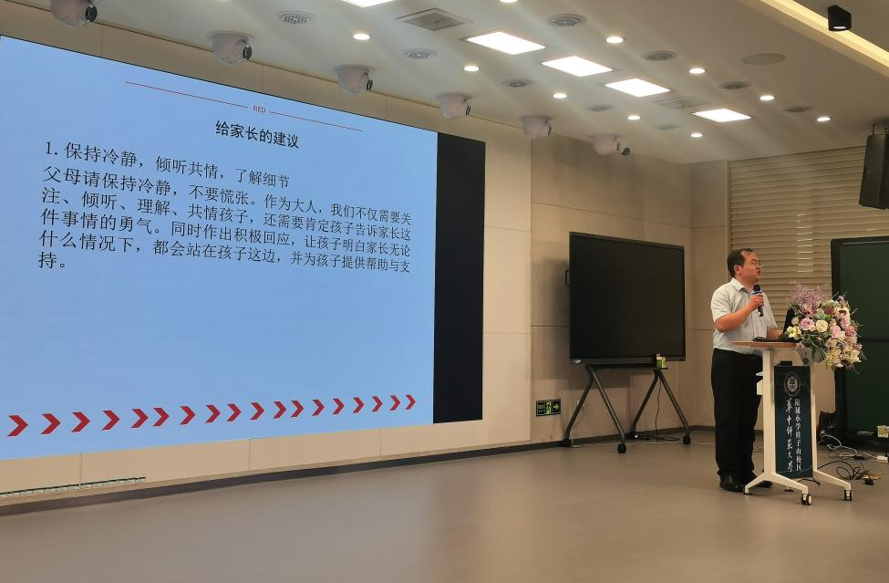 接着,华师大法学院副院长肖登辉教授为家长们作了《对校园欺凌说“不”》预防校园欺凌主题讲座。肖教授以近期发生的校园欺凌案例为切入口,从校园欺凌的内涵、类型、危害以及给家长的具体建议等方面进行了专业的讲解。肖教授的讲座内容发人深省,对防范校园欺凌、净化校园环境、保护学生身心健康有着重要意义。本次讲座宣传普及了预防性侵害知识、增强了家长对校园欺凌的关注,收获家长们的一致好评。