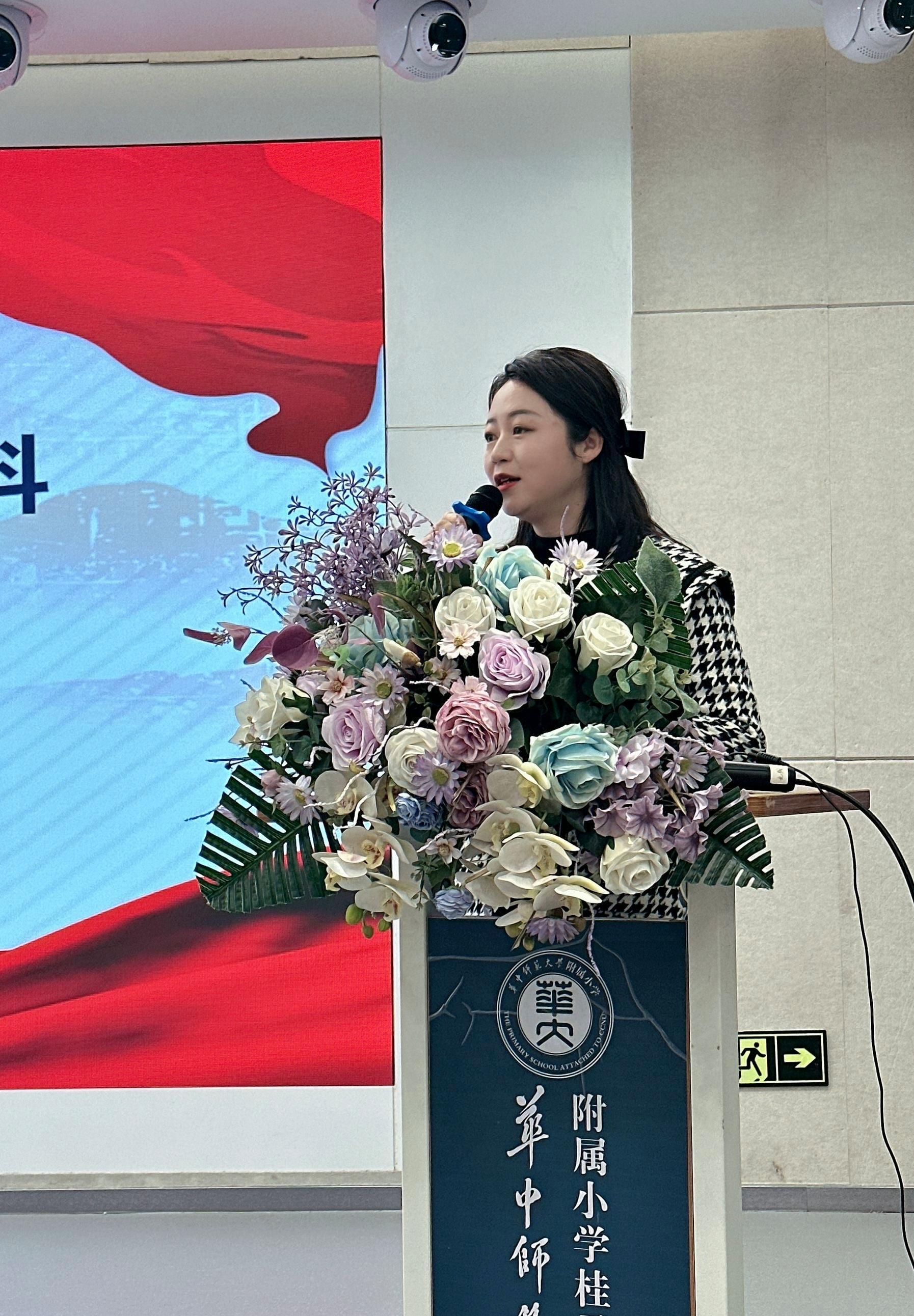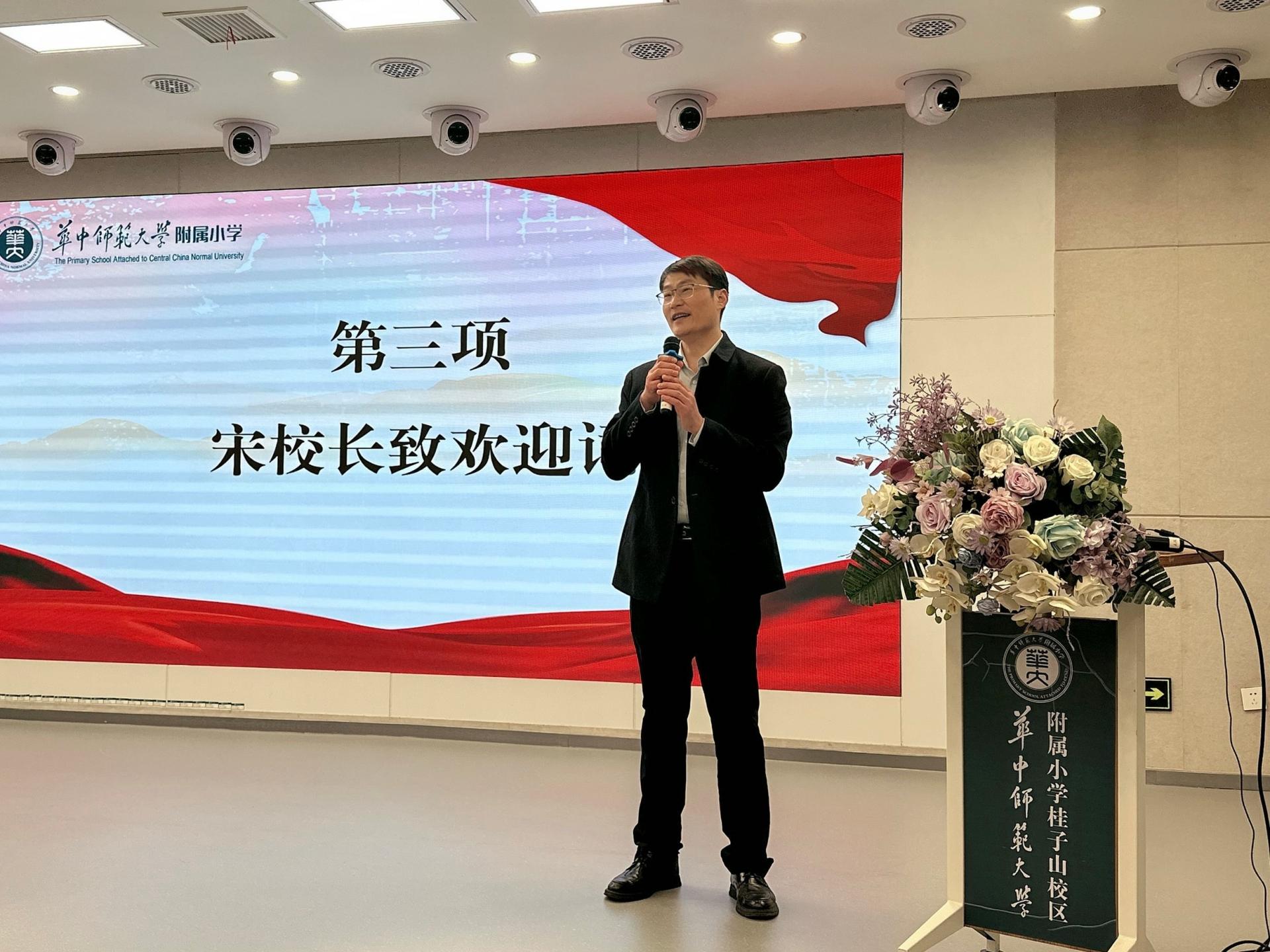紧接着,基地校华师附小宋涛校长致欢迎词。教师,应秉持“大先生”之大,有大情怀、大追求。有“吾将上下而求索”的决心,有“捧着一颗心来,不带半根草去”的奉献,有“一个灵魂唤醒另一个灵魂”的觉悟,让微光成矩,点亮世界。宋校长鼓励教师们努力钻研、积极进取,在心中播撒成为“教育家”的梦想种子,在团队协作中共同成长。他还表示,基地校将竭尽全力为成员搭建平台,助力教师成长。