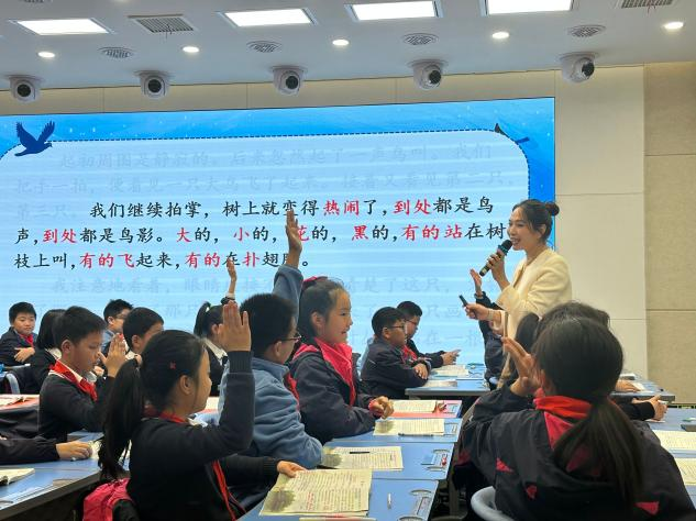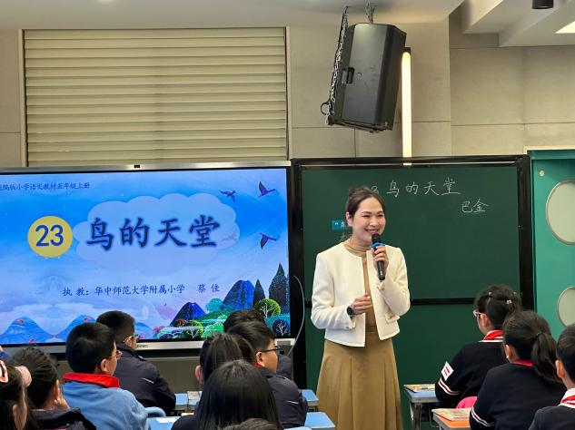 在王颖老师的主持下,华师附小语文文心组成员蔡佳老师紧扣学习任务群,为大家展示了五年级上册《鸟的天堂》第二课时的课堂教学。蔡老师的课重点突出,层次分明,课堂语言富有感染力,让学生通过一遍遍朗读感知课文的语言之美,感悟“鸟的天堂”的非凡魅力。课堂教学既有大单元教学意识的体现,又有学习任务群的组织呈现,还借助了合适的语言运用情景培养学生语文素养。