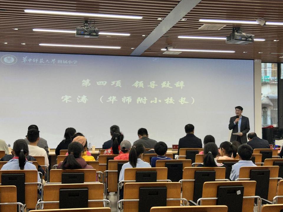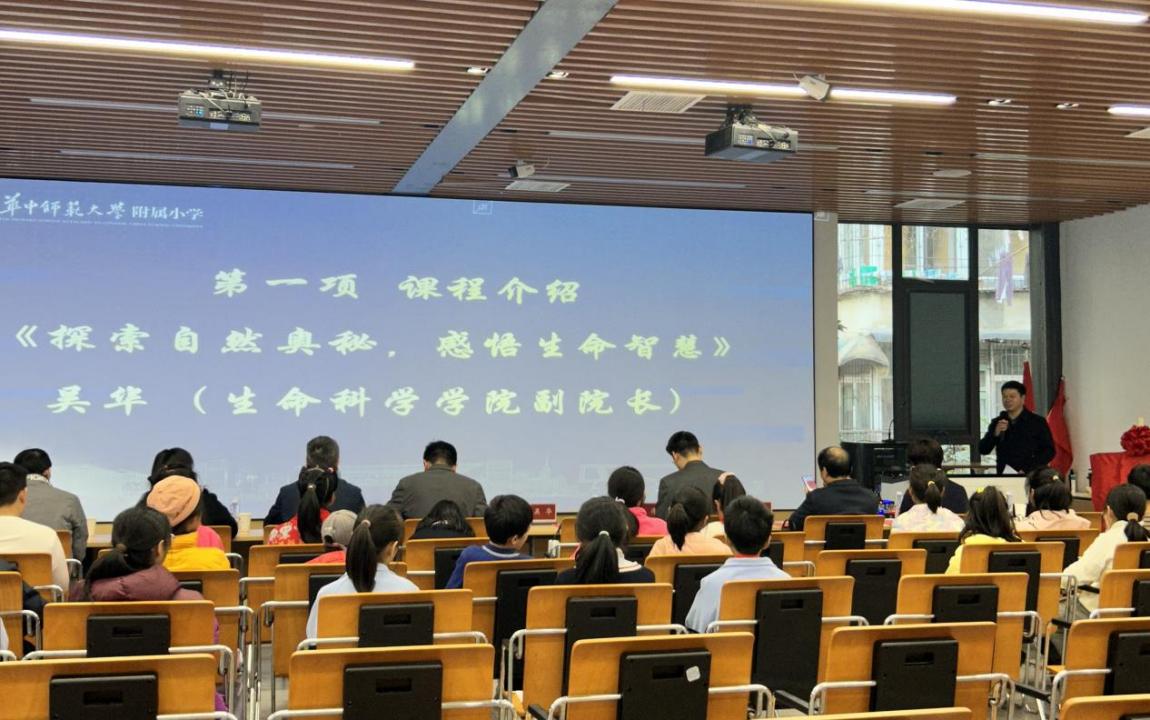 生科院副院长吴华首先围绕《探索自然奥秘,感悟生命智慧》课程建设进行了介绍,他提到科普大讲堂将更好发挥专家教授团队的示范效应,吸引更多学科专业、不同领域的专家老师们走进附小的“科普大讲堂”,弘扬科学精神,培养科学素养,将科学的种子播撒在孩子心里,助力附小建成一流的“少年科学院”。