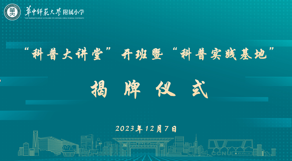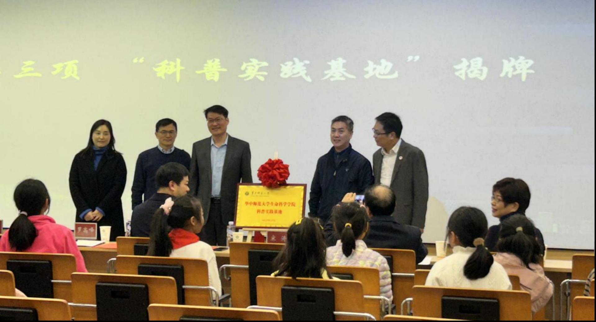 12月7日下午,华中师范大学附属小学“科普大讲堂”开班暨“华中师范大学生命科学学院科普实践基地”揭牌仪式在附小生贵厅举行。华中师大国内合作与培训管理处处长罗高峰,华中师大本科生院副院长张静,华中师大生命科学学院党委书记郑宁、党委副书记姚珂、副院长吴华、国家级人才称号获得者黄双全教授、国家级人才称号获得者闵金荣教授、国家级人才称号获得者朱曼璐教授等生科院教师和华中师大附属小学校长宋涛、副校长甘爱民等出席仪式。活动由生科院党委副书记姚珂主持。