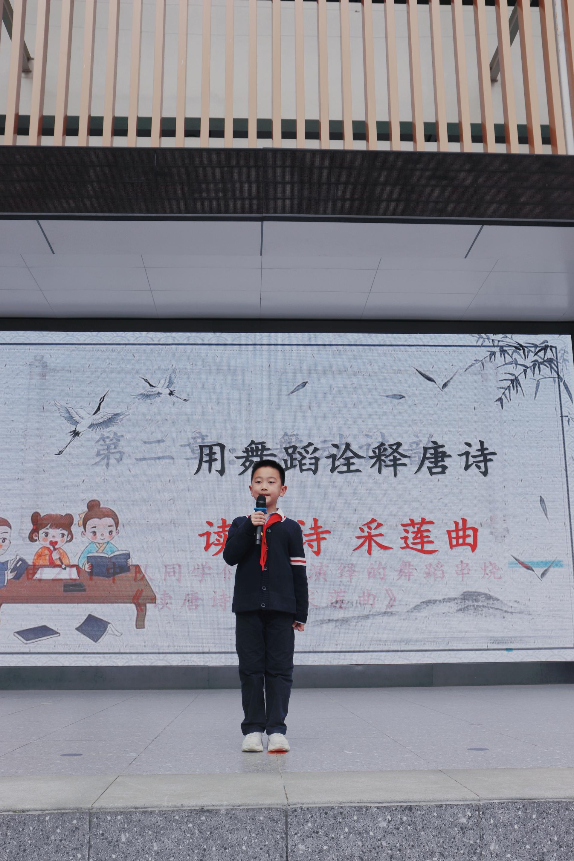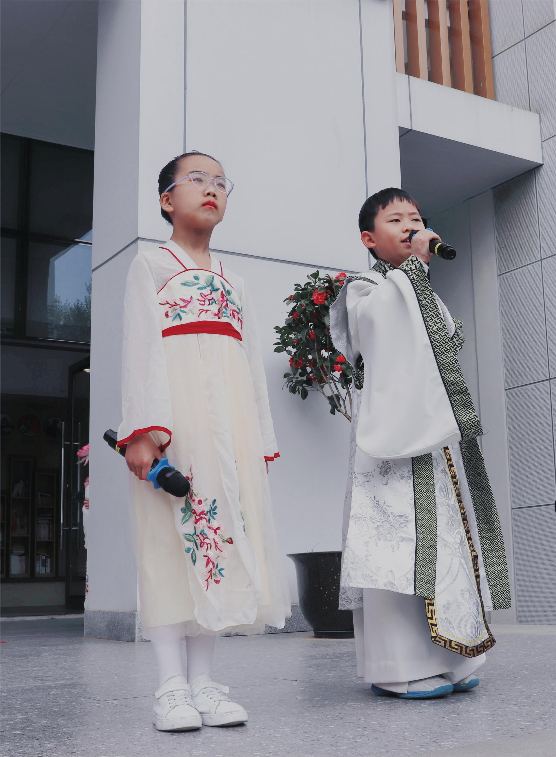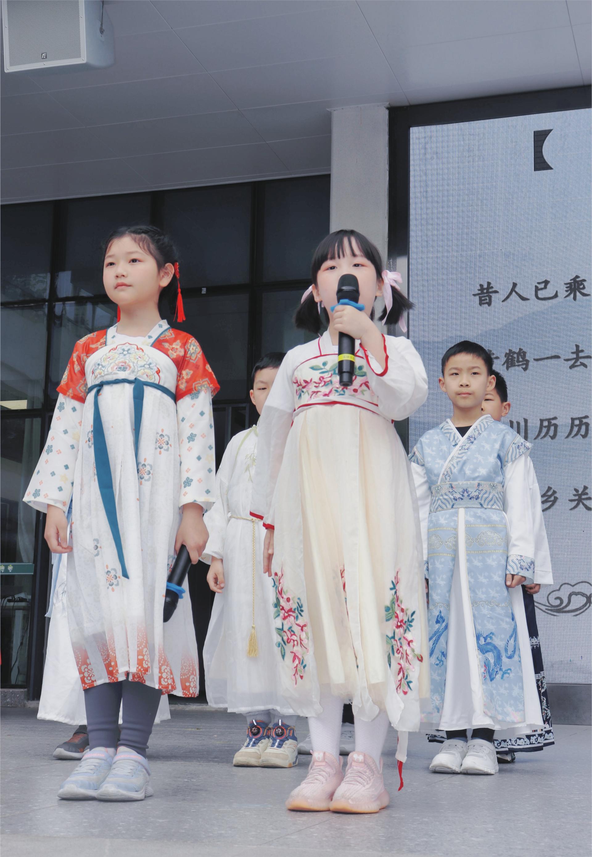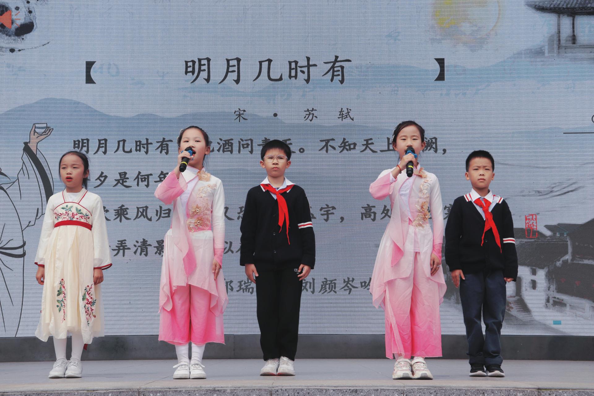 古诗词中的音律之美,把诗人的喜怒哀乐诠释得淋漓尽致。郑瑞淇和刘颜岑用宛转悠扬的童声吟唱了苏轼的《水调歌头》(明月几时有)。全校师生齐声合唱,校园成为了歌声的海洋。