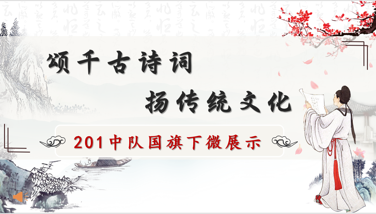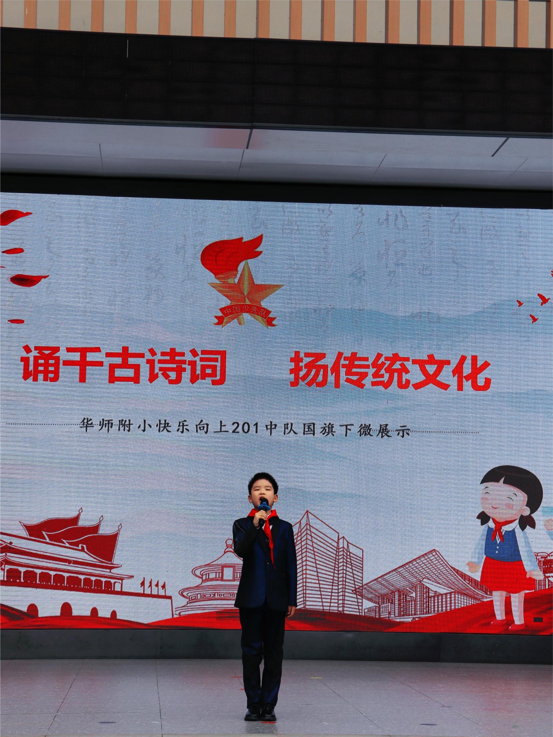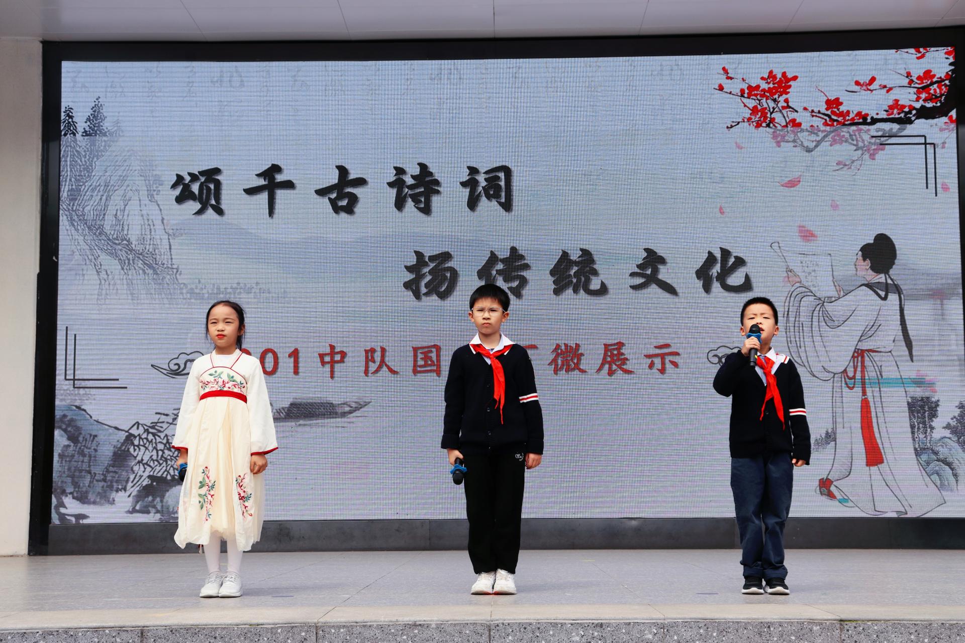 升旗仪式结束后,201中队国旗下微展示拉开了帷幕。三位主持人罗语珩、孙彦博和王行迩走上台,落落大方地介绍本次微展示的主题为:颂千古诗词,扬传统文化。五千年文化,三千年诗韵,中国的诗词历经千年,依旧闪耀生辉。古诗词中流淌着中国人沉淀下来的千年文化与智慧。全校师生都对接下来的微展示充满了期待。