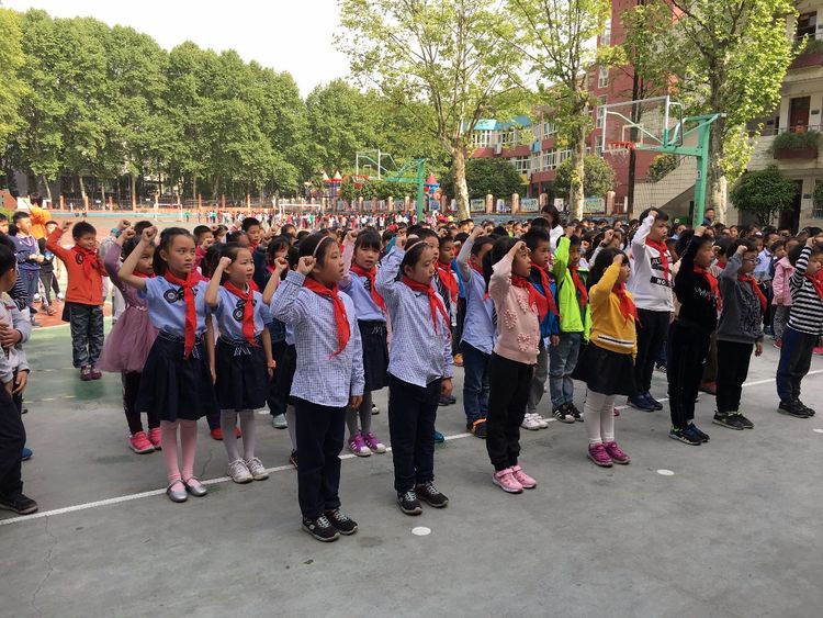 在大队长包怡诺同学的带领下,全体新队员呼号,一句"时刻准备着!"响彻校园上空。