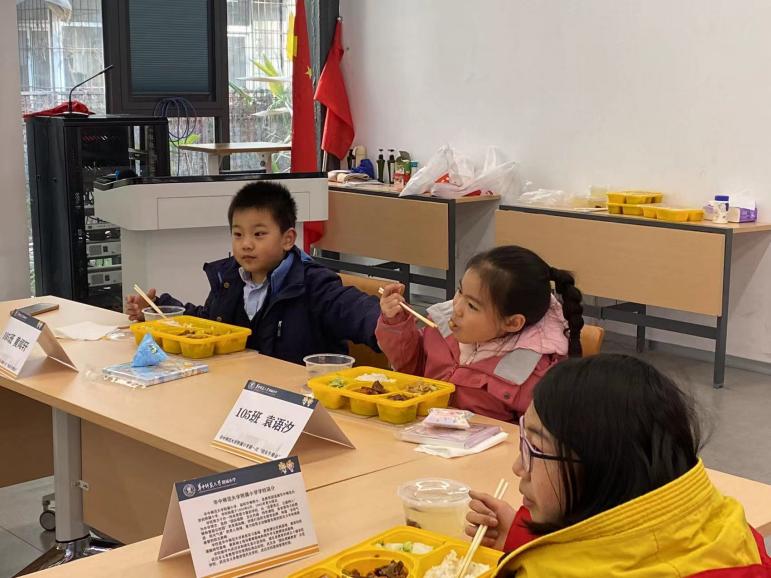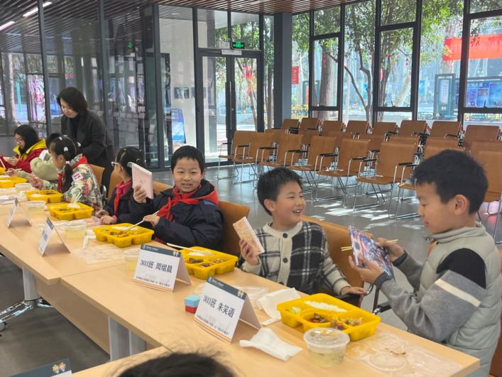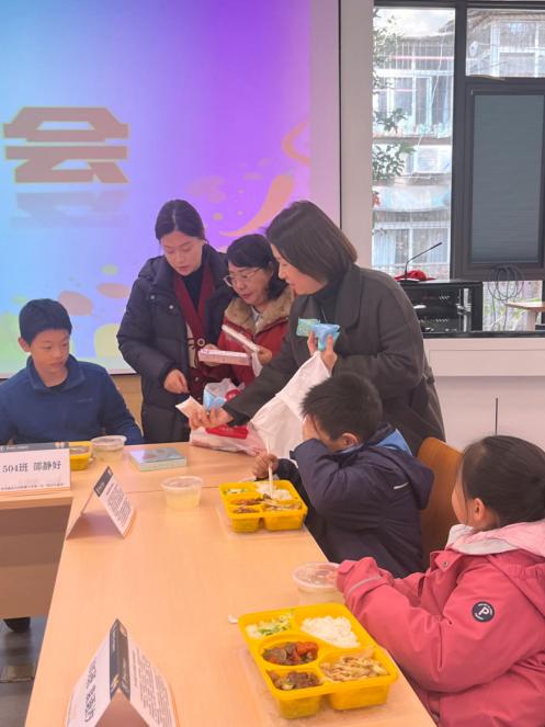 杨冬菊副校长、唐从义主席、曹兰主任和大队辅导员张玉珂老师也陪伴着学子们,他们或帮孩子们打开餐盒,或为孩子们发放午餐会小惊喜。