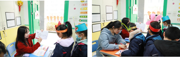 其中,“新春快乐对对碰”环节更是别出心裁,将美育和劳育融入智育之中。学生们运用美术工具制作头饰,现场装饰并展示,不仅锻炼了动手能力和审美能力,还加深了对春节习俗的了解和喜爱。这种跨学科、综合性的评价方式,真正突出了“实践性”和“综合性”,全面提升了学生的语文素养和综合能力。