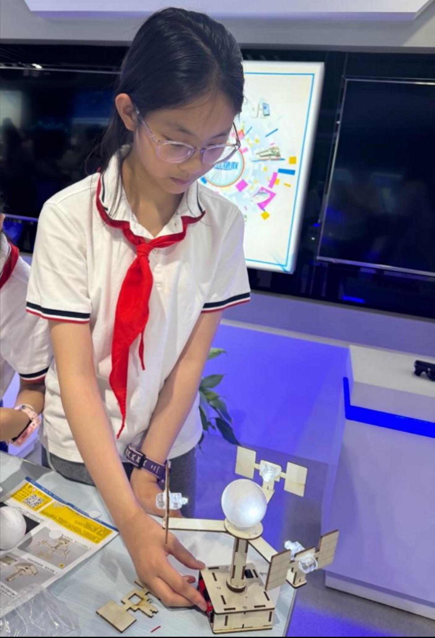 随后,同学们开始了实践之旅。在李总的细致讲解与耐心指导下,同学们组装主题、电源等,在不断地尝试和努力下,成功组装了地球同步卫星模型,体会到了实践的乐趣。
