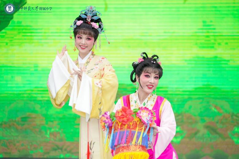 文艺庆典节目中,荆州花鼓戏剧学院的谢婷婷老师和吴珍珍老师为孩子们带来的花鼓戏《摘花》,让人欣喜不已。婉转的唱腔如同溪水潺潺,穿越岁月的尘埃,让这古老的旋律在现代的舞台上重新焕发生机,孩子们的眼神中充满了对这份艺术之美的惊奇与崇敬。