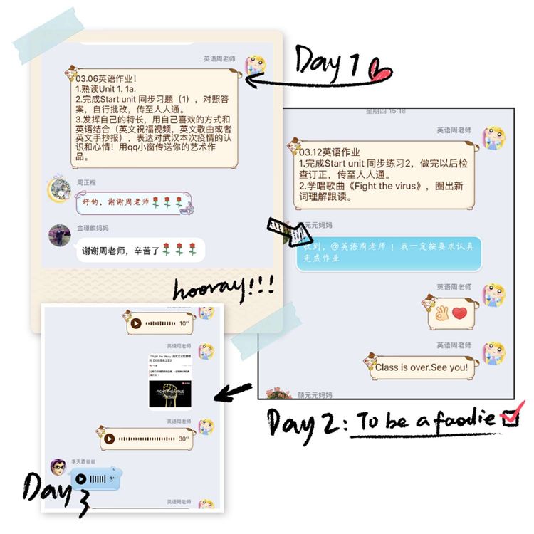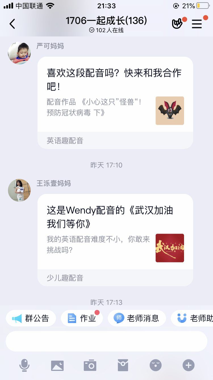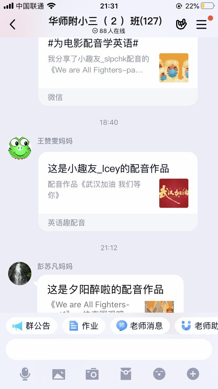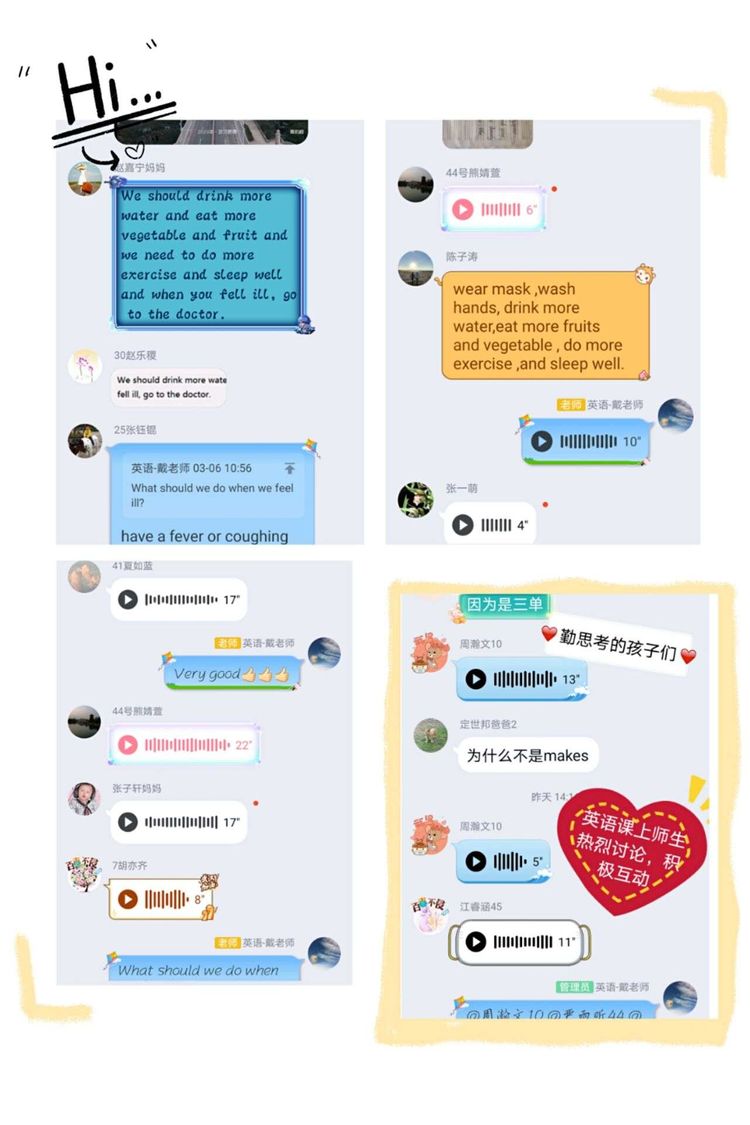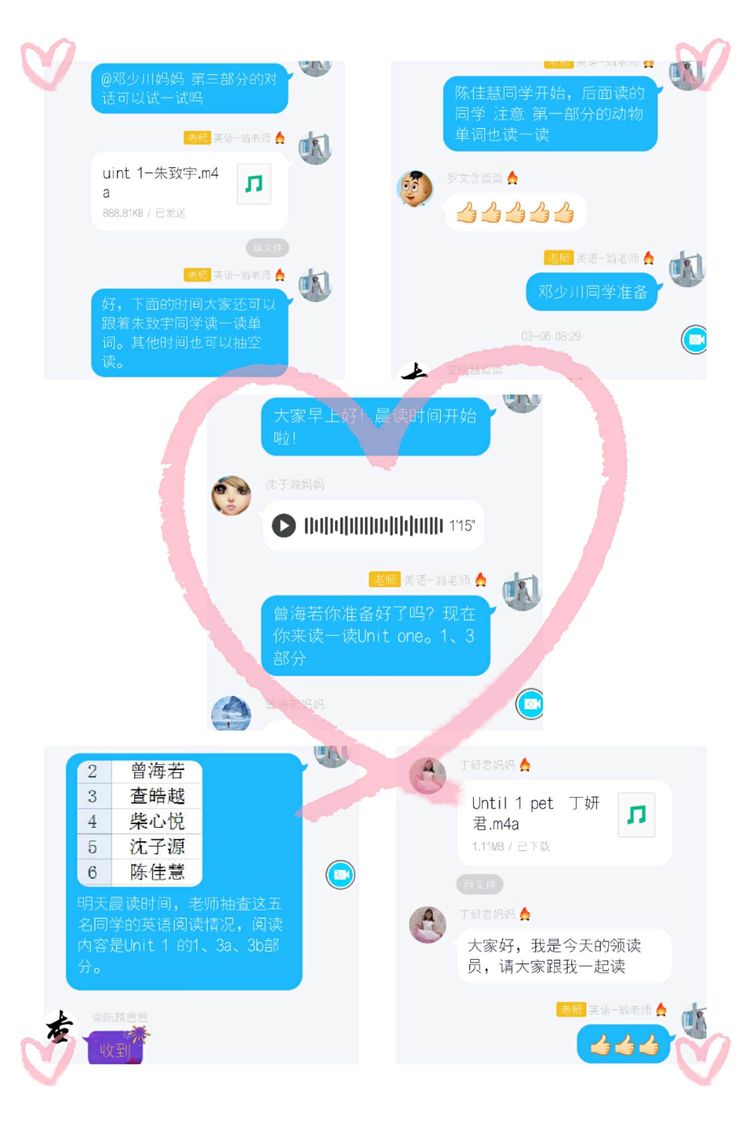 一年之计在于春,一日之计在于晨。让孩子们开口,大声地把英语读出来,三年级老师是这样组织的。每周都会安排晨读的小小领读员,领读员提前一天录好音频,第二天早上8:20准时把音频发到班级群中,于是全班同学便开始了激情的晨读时光。相互交流间不禁碰撞出积极向上的火花!