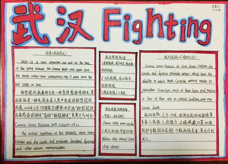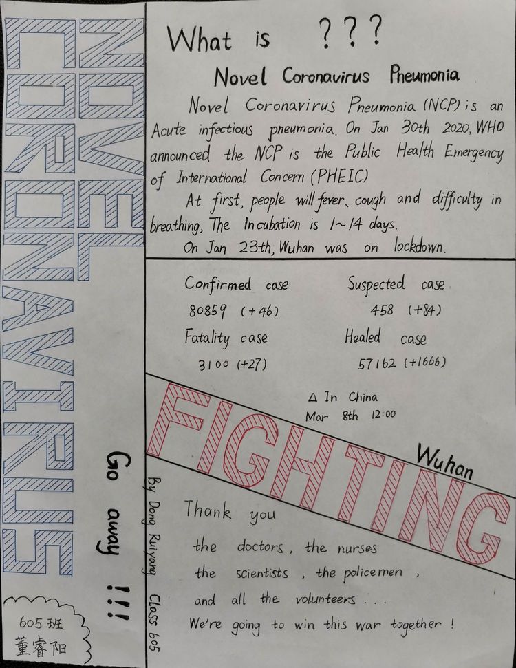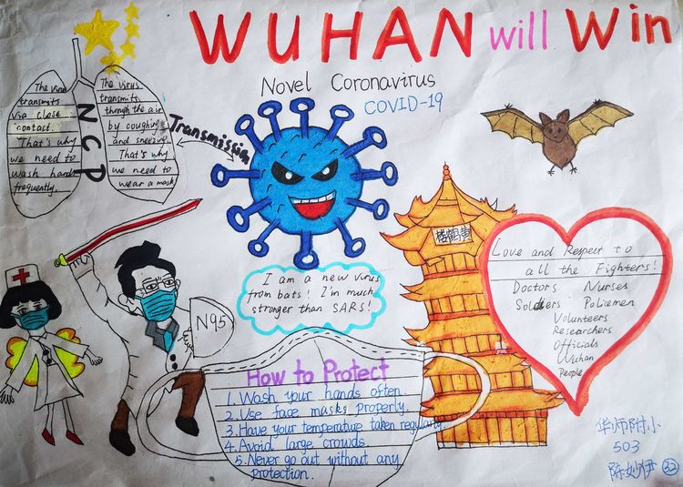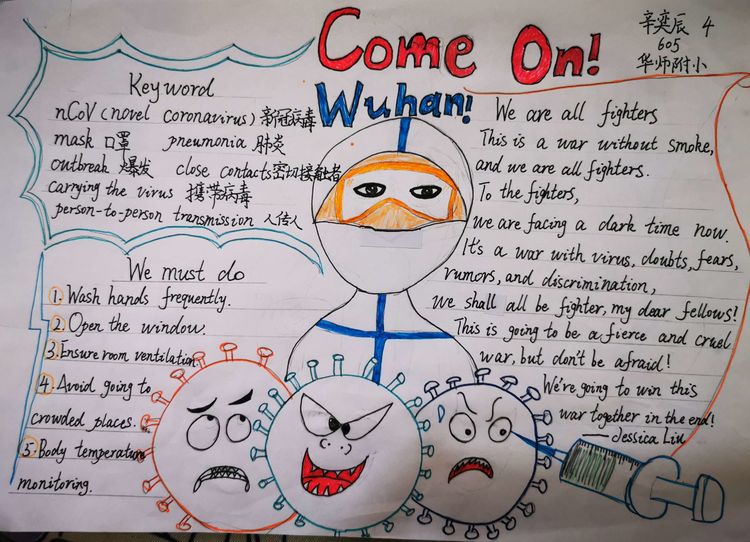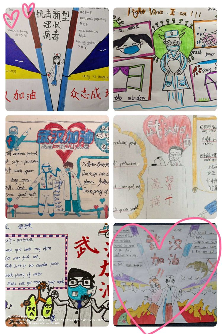 疫情期间,本着“停课不停学”的原则,六年级英语老师融合学科内容,应用网络资源进行在线答疑、在线总结和评价的教学。在英语网络课堂上,老师带着学生们认识了新型冠状病毒NCP和COVID-19的英语表达法,并拓展相关的高频词汇(如口罩、隔离、潜伏期的词汇),课堂上以歌声传情,还向学生推荐由新加坡艺人Alvin将英文经典老歌《The Sound of Silence 》翻唱改编的《对抗病毒之歌》(Fight the virus),在教读单词或欣赏英文歌曲的同时,师生隔屏跟读、欣赏聆听,好一番你不在我身边胜似在我身边的画面。同时,老师引导学生们发挥自己的特长,与英语学科结合起来,制作属于自己的小作品(如英语趣配音、手抄报、英文防疫小常识、英文录音等形式),以此来表达对武汉本次疫情的独特认识和关切心情。