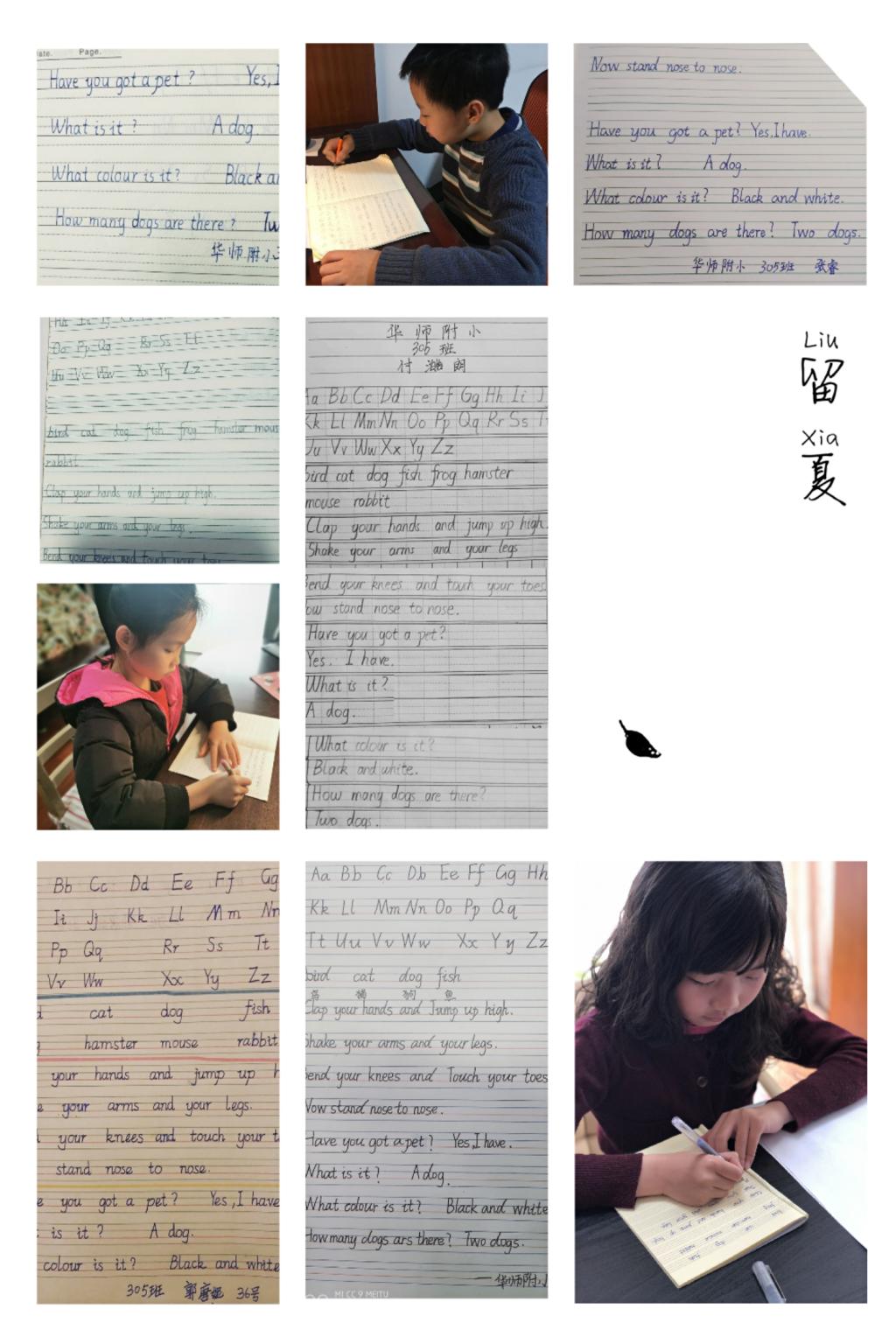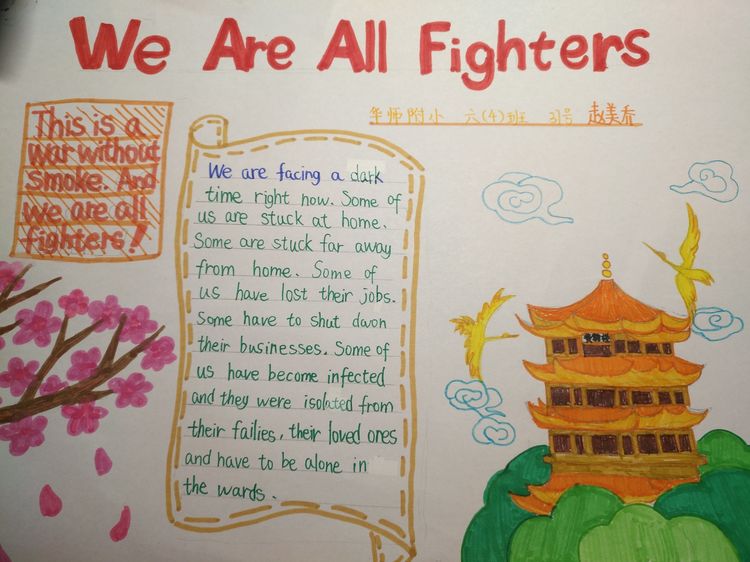 我校英语备课组全体教师在疫情时期也跟着孩子们停课不停学,不断地学习新的教育理念和信息化的教学手段,探索新型在线教学模式。在华师附小主办的题为“张扬个性,以艺抗疫”的文化节活动中,利用“疫情”这个特殊的教材,让孩子们的英语学习,坐在云端、诵在线上、思于纸上、用于实践,成就了一个个鲜活的用心有爱的抗疫作品。