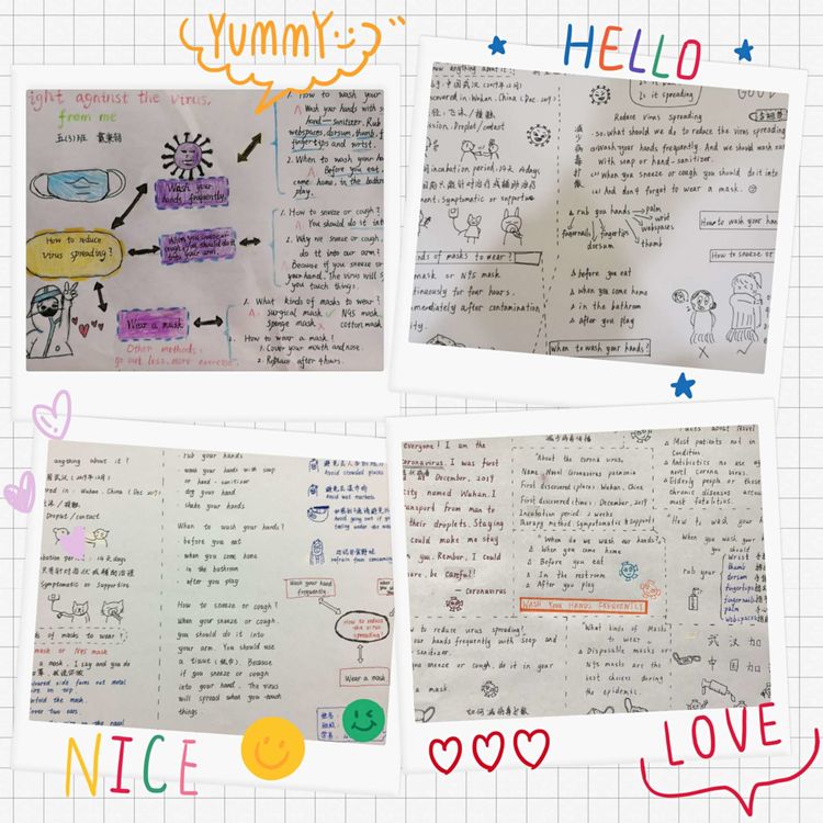 草长莺飞的三月天,猝不及防的疫情让校园变得空荡。虽少了校园里书声琅琅,但是,“停课不停学”,“停教不停研”,一个个响亮的口号让这个春天依旧明媚!五年级英语老师虽然在外地只能用手机授课,但积极寻找网络资源,并用视频软件进行编辑、整合,力求通过多种活动让学生全方面得到提升。就这样,文化节活动奏响了这个春天的抗疫战歌!在英语老师的引导下,孩子们赏析了Reduce Virus Spreading和 Go Away, Novel Coronavirus两节微课。老师与孩子们在课上从词、句分析入手,对新冠病毒进行认知,不仅明确了How does the virus transmit?,还对What should we do?进行了热烈讨论。课后,孩子们热情高涨,发挥自己的聪明才智,以制作手抄报、为演讲配音、画思维导图等方式展示自己的课后收获,还有同学在老师的指导下动手写英语版的“七步洗手法”,并拍成视频发至网上。