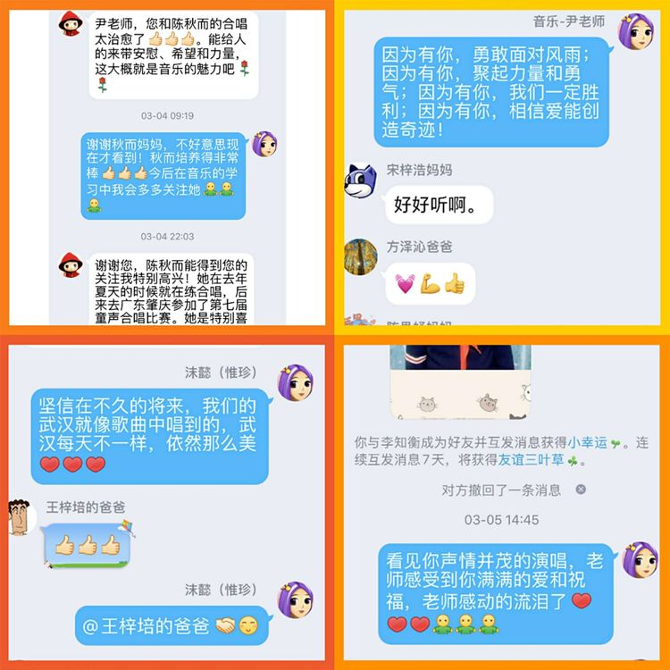嘹亮的歌声可以慰藉心灵,铿锵的旋律更能催人奋进!音乐组老师给孩子们推荐欣赏《武汉伢》、《我希望》、《学习雷锋好榜样》、《金翅膀的百灵鸟》、《天之大》、《幸福平安》,并教授演唱。让悠悠乐声,陪伴着大家度过这段特殊的时光,放飞音乐的旋律,用爱打赢这场战“疫”!