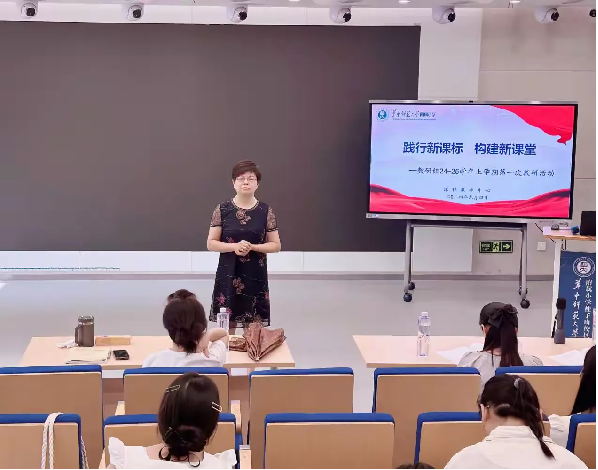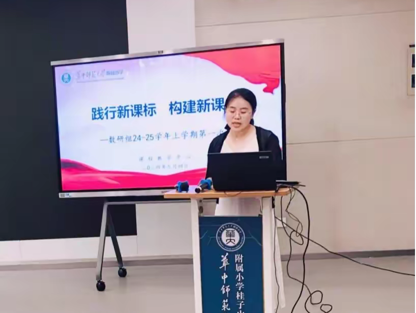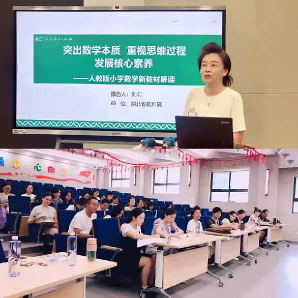 新学期开学之际,为进一步拓展教师视野,更新教育理念,贯彻落实新课标,精准把握新教材,让核心素养在课堂中落地生根,2024年9月4日下午,华师附小数研组以“践行新课标,构建新课堂”为主题的课例研讨活动在阶梯教室正式拉开序幕。本次活动特邀湖北省教育科学研究院小学数学教研员刘莉老师为我们开展主题为《突出数学本质、重视思维过程、发展核心素养》的小学数学新教材解读培训。甘爱民副校长、课程中心李丹主任、华师附小两校区全体数学教师全程参与。