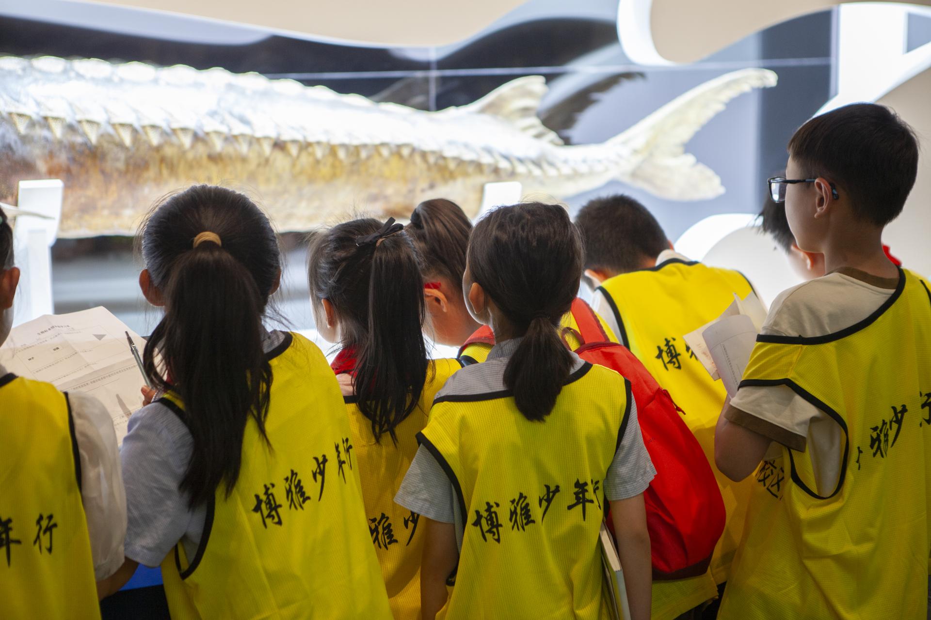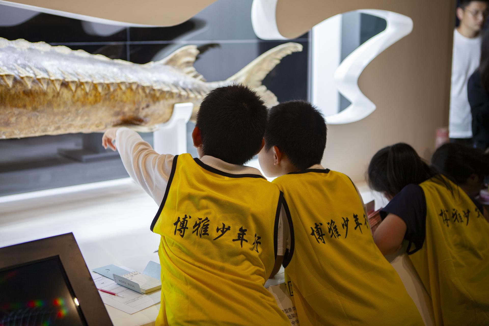 在“鳍之漪(鱼)”展厅前,同学们纷纷驻足观察着一具中华鲟古生物化石。讲解员介绍到:中华鲟是一种大型的溯河洄游性鱼类,被誉为“水中大熊猫”,曾是恐龙的小伙伴。但近几年,中华鲟野外生存状况堪忧,全球的27种鲟鱼中,有23种濒临灭绝……走出展厅,同学们深受触动,在笔记本上写到“我们要爱护环境,保护大自然,保护野生动物。”