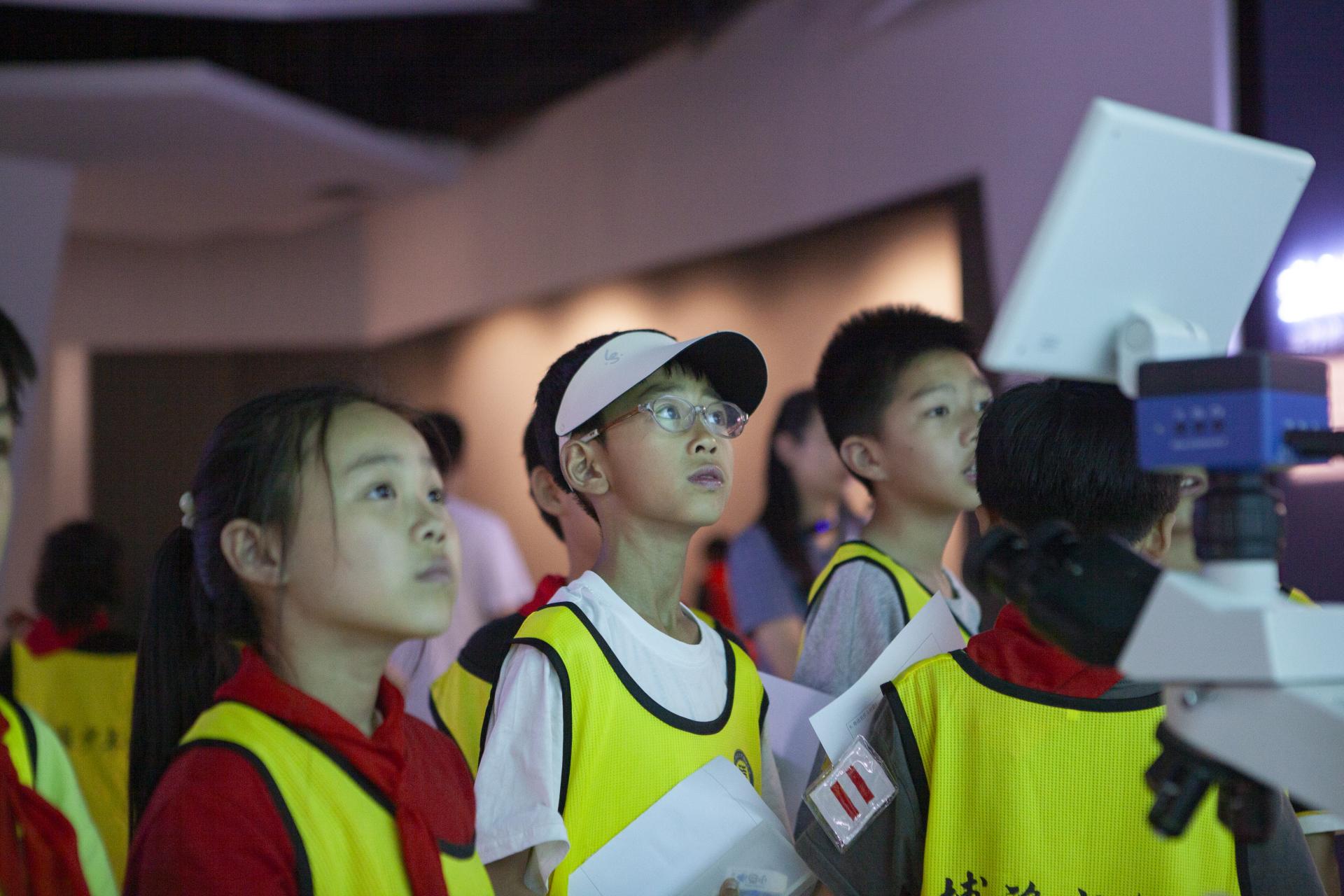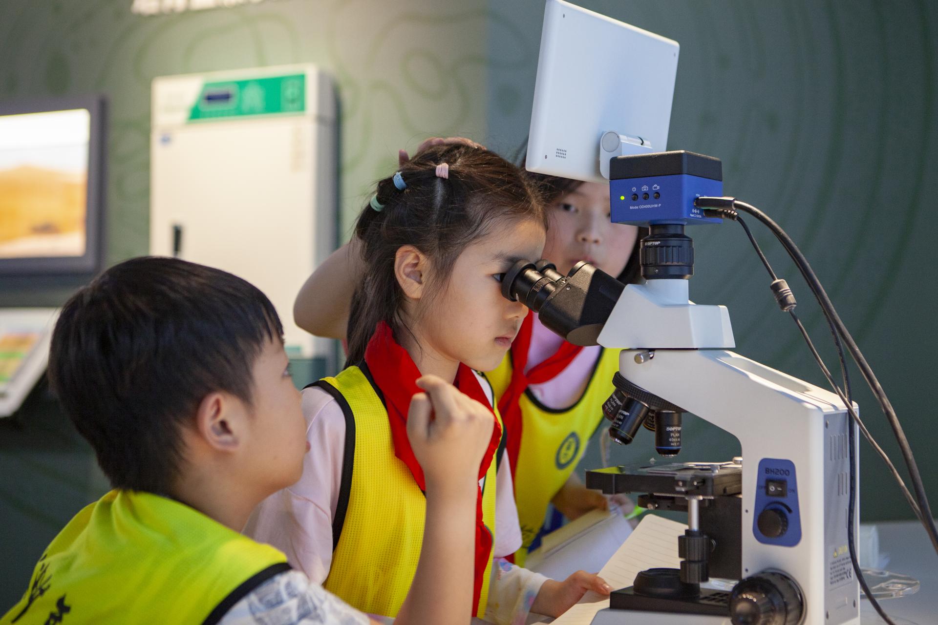 在“氧之源(蓝细菌)”展厅中,同学们对四周的展板展现出了浓厚的兴趣,在一个显微镜展品前依次观察标本。水中的蓝细菌是原核生物,学名蓝藻。在所有藻类生物中,蓝藻是最简单、最原始的一种。蓝藻是单细胞生物,没有细胞核,和细菌一样,蓝藻属于“原核生物”。