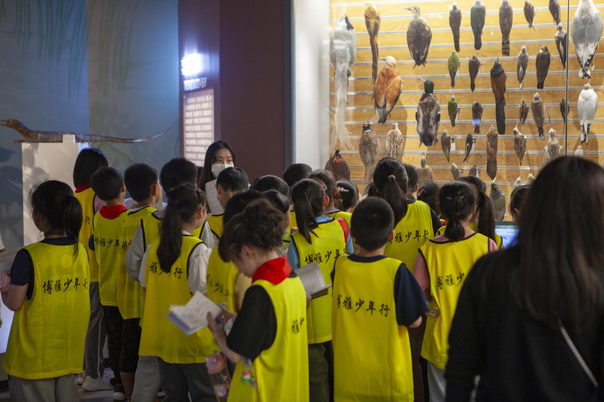 走入“羽之纷(鸟)”的展厅时,同学们被一个个鸟类动物的标本所震撼。讲解员依次讲解着各种鸟类的学名、习性、生存方式,同学们全神贯注,认真、细致地观看着每一个标本,也时不时地提出自己的问题,与讲解员积极互动,讲解员一一解答。