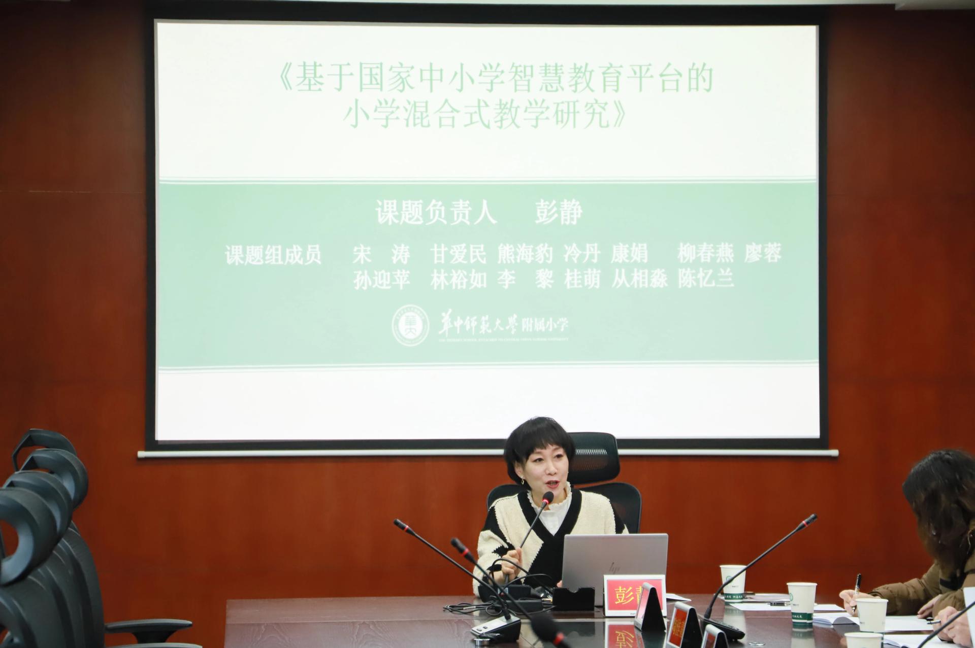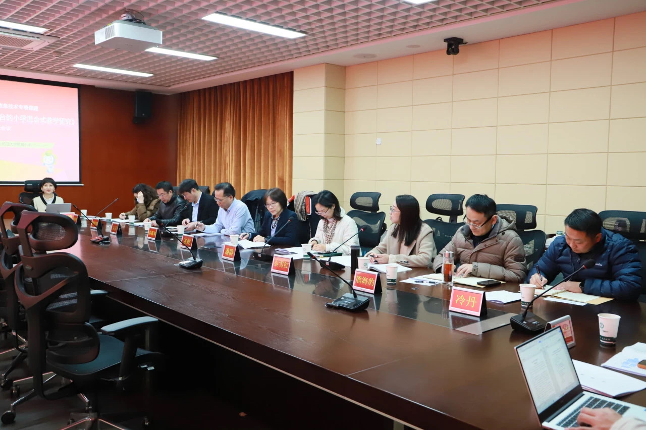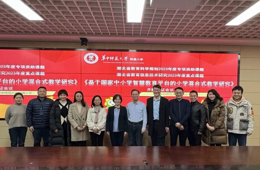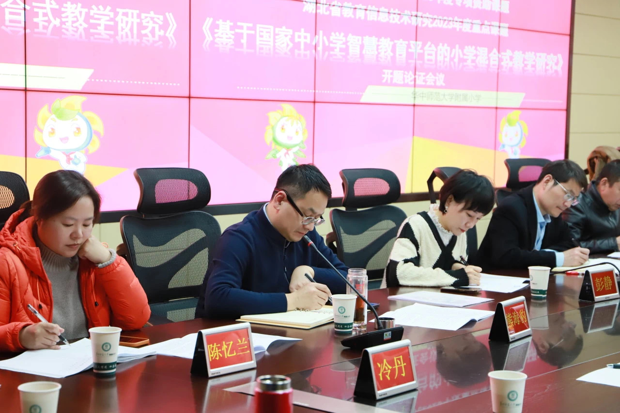 “科研蓄力,笃行不怠”。室外冬日暖阳,室内如沐春风。2023年12月13日上午,华中师范大学附属小学在会议室举行湖北省教育信息技术研究2023年度重点课题《基于国家中小学智慧教育平台的小学混合式教学研究》的开题论证会。本次会议由武汉市洪山区教育信息技术中心教研员秦雪红主持。此次开题论证会特邀华中师范大学教育信息技术学院张屹教授,湖北省电化教育馆研究部主任姜新华和湖北省电化教育馆研究部副主任潘静到会指导。华中师范大学附属小学校长宋涛,华中师范大学附属小学教师发展中心主任兼遵义师范学院附属实验学校校长助理陶佳喜,华中师范大学附属小学南湖校区负责人彭静,华中师范大学附属小学教师发展中心柳春燕主任,华中师范大学附属小学南湖校区办公室主任冷丹,华中师范大学附属小学南湖校区信息中心主任熊海豹,以及课题组成员参加本次开题论证会。