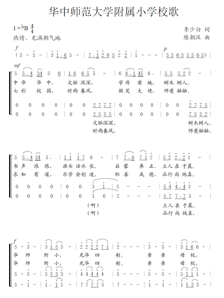 华中师范大学音乐学院教授、作曲家陈朝汉教授为华师附小校歌谱曲,歌曲欢快明亮、热情而富有朝气,表现胸怀远大志向的阳光少年的精神风貌。