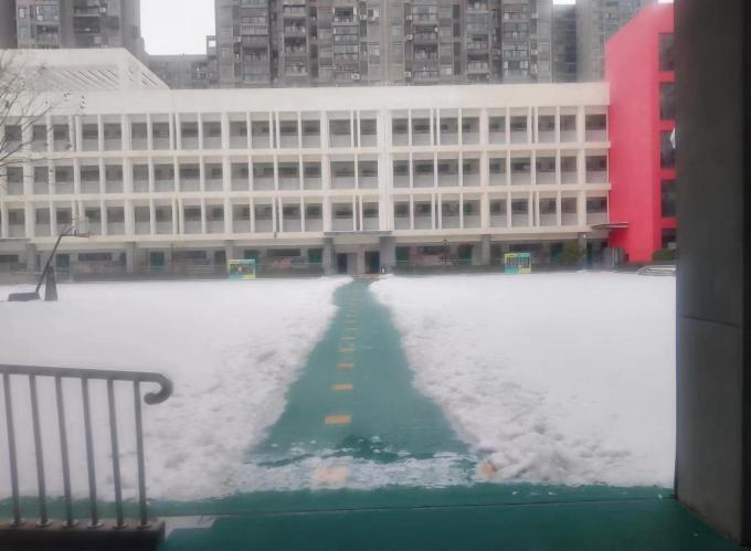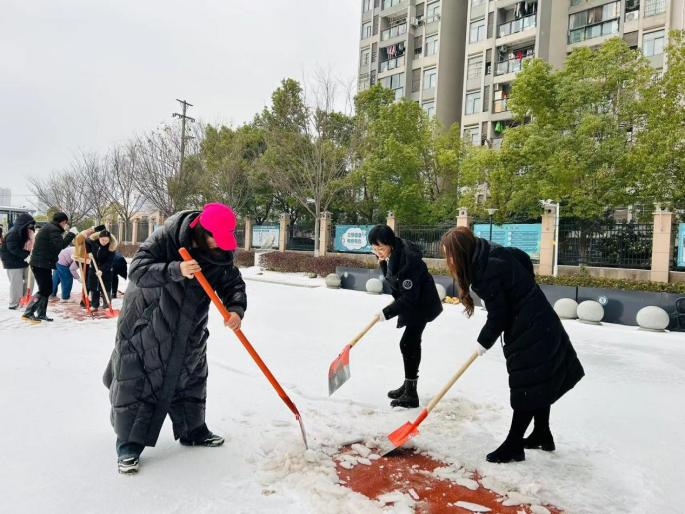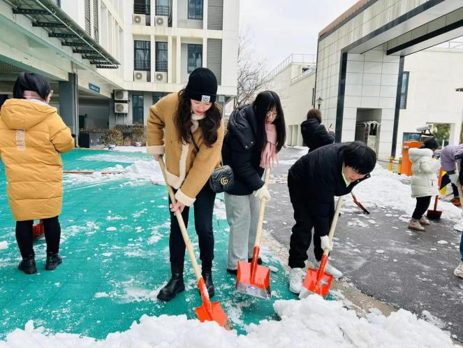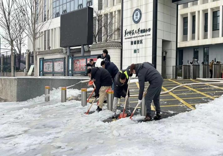 行动是最好的“融雪剂”。学校后勤部门第一时间拿出除雪方案,准备除雪工具,“校园除雪突击队”在校区负责人彭静和支部书记冷丹的统一指挥下,热情高涨。大家挥舞着铁锹,铲冰层、扫积雪、清杂物、除路障,干劲十足。齐心协力,配合默契,仅用3小时就将学校的南门、西门的积雪扫除干净,校园内也打通了一条人行通道,为师生疏通了一条温暖安心的返校路。老师们忙碌的身影在皑皑白雪中构成了一道道亮丽的风景线,让校园暖意浓浓。