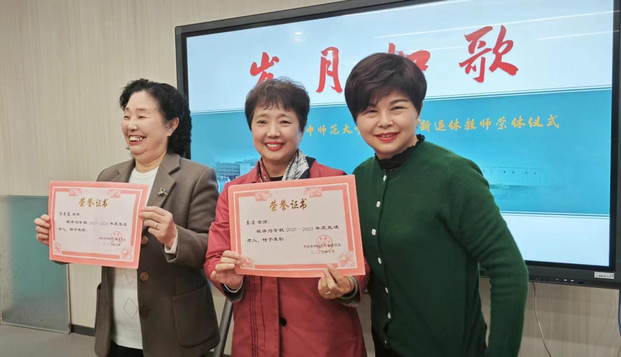 美好的时光总是短暂,座谈会接近尾声。校长宋涛亲自为三位退休教师颁发荣休证书,这不仅仅是一张光荣的证书,更是她们教学生涯的结晶,无私奉献的证明。随后副校长甘爱民也为退休支部书记吴爱莲、老协分会会长颁发“先进老人”证书,这两位慈祥乐观的“老人”也张开怀抱,以幽默风趣的话语,热情洋溢地欢迎三位新成员的加入。