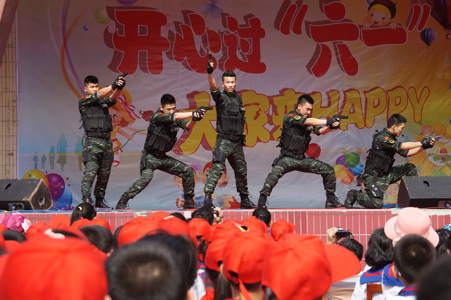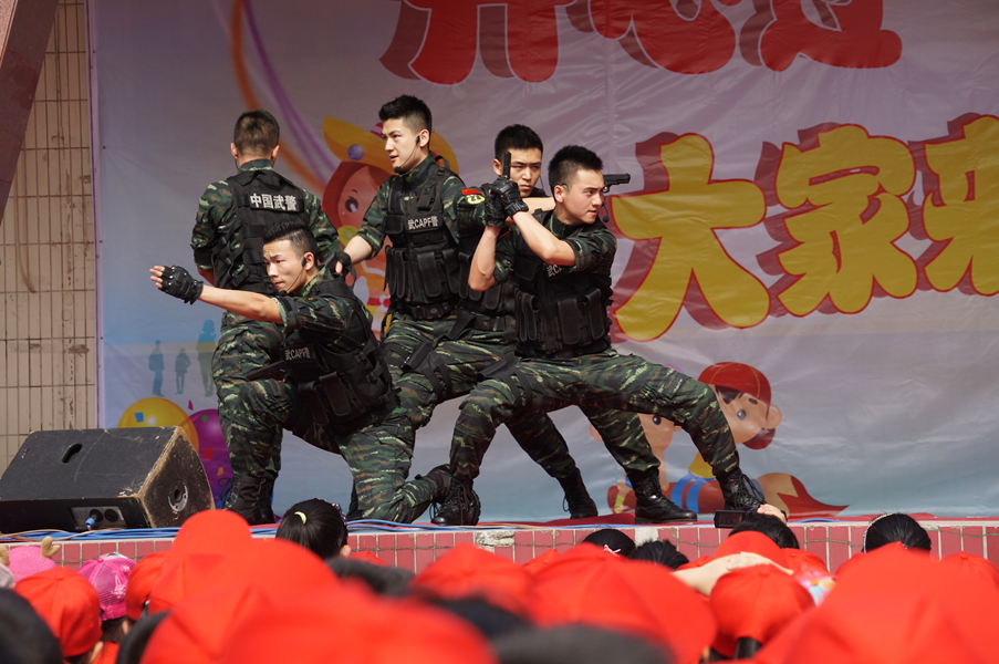 As the special guest of our school, the cultural troupe of Chinese Armed Police Force in Hubei Province presented an amazing show for the children. The face-changing performances and revolutionary songs they performed caught the eyes of the children and made the ceremony more pleasant.