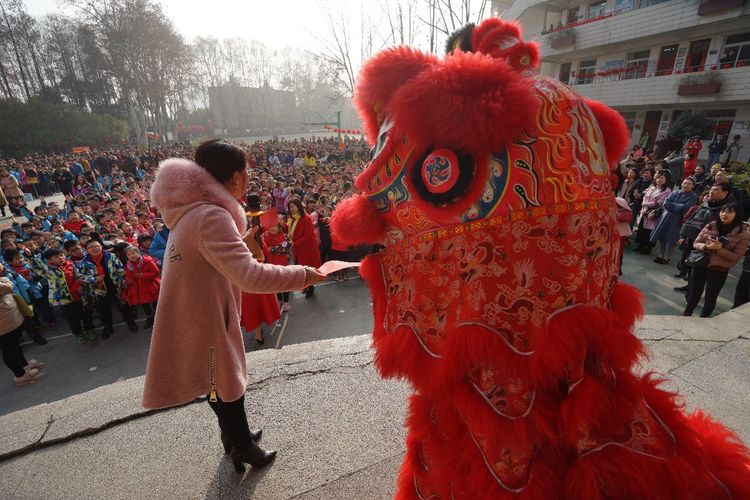 两头醒狮为全校师生献上了"新年快乐,大展宏图"的对联。这副对联,也饱含着学校沈校长对师生们新年的祝福。