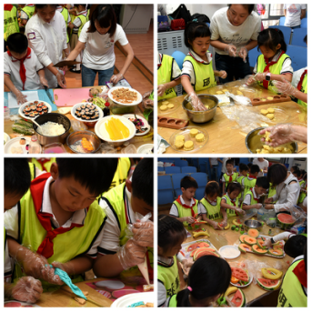 “蛋糕组,这边。”“寿司组,跟我来。”“饼干组,排好队。”“绿豆糕组,出发。”“水果组,我们加油。”55个小厨师分成5个小组,随着陈老师一声令下,今天的美食之旅正式开始。