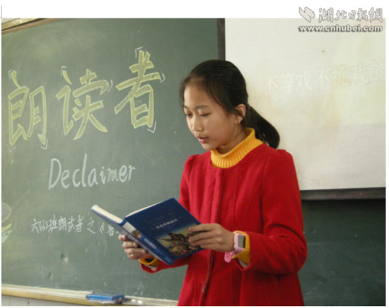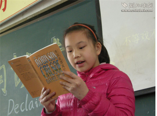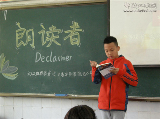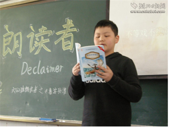 4月13日的一节语文课上,603班的同学们体验了一次“朗读者”的感觉,分别展示了名著《鲁滨孙漂流记》的片断内容。