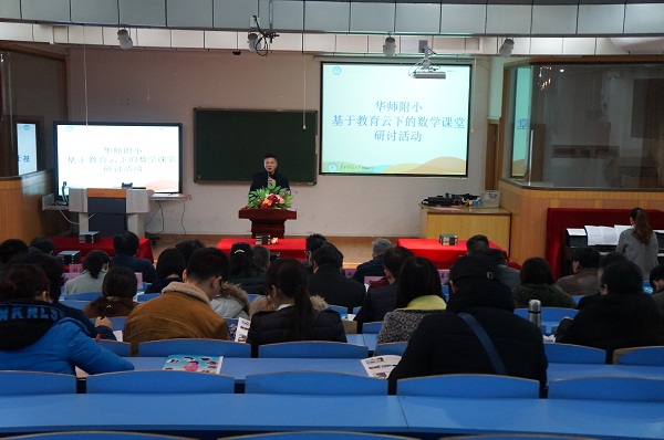 2015年11月24日上午,气温陡降、寒气袭人,华师附小的阶梯教室却是高朋满座、春意盎然。为推动教育云技术在教育教学中的深入应用,促进信息技术与教育教学深度融合,华师附小“基于教育云下的小学数学课堂研讨”暨董艳工作室阶段汇报活动如期举行。洪山区教育局尹卫华局长、李春德书记,华中师范大学教育学院周东明教授和湖北省教科院数学教研员刘莉老师等领导、专家莅临活动现场指导工作。洪山区教育局各科室负责人、教科培中心领导以及兄弟学校近200人参加了本次活动。