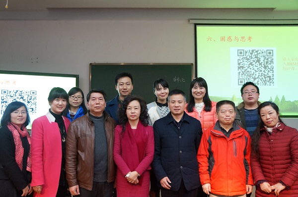 授课结束后,工作室五位教师代表和华师附小三位资深教研组长进行现场教研互动,分享自己的体会和思考。董艳老师以“传统餐饮业向自助餐发展”的生动比喻指出了学生学习方式变革的重要性,谢能超老师着重阐述了对“互联网%2B享受教育”的思考,陈莹老师介绍了两次试教过程中发现的问题及微课设计的调整思路。其他老师就“互联网%2B教育”形势下的数学课堂谈了自己的理解和思考,指出数学课堂一定要坚持“教育为本、互联网为用” 原则,要实现从知识教育向思维教育转变。同时,参会教师也利用微信扫描二维码,积极参与现场互动。