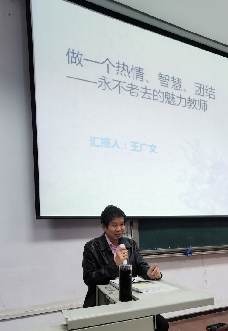 华师一附中王广文老师,2016年被湖北省教育厅授予“师德先进个人”。会议中,他以《做一个热情、智慧、团结——永不老去的魅力教师》为题的报告中讲述了他持之以恒的教学理念,在教师岗位上尽心尽力,培养学生的能力,给学生树立信心,教育学生品学兼优。王老师用生动的例子,讲述了他在面对不同孩子、不同教育情况时,是如何耐心用心地疏导关爱孩子,成为学生心目中信赖的好老师。“捧着一颗心,不带半根草去”,王老师用爱心呵护每一个孩子成长,为我们全体教职工树立了学习和行动的榜样。