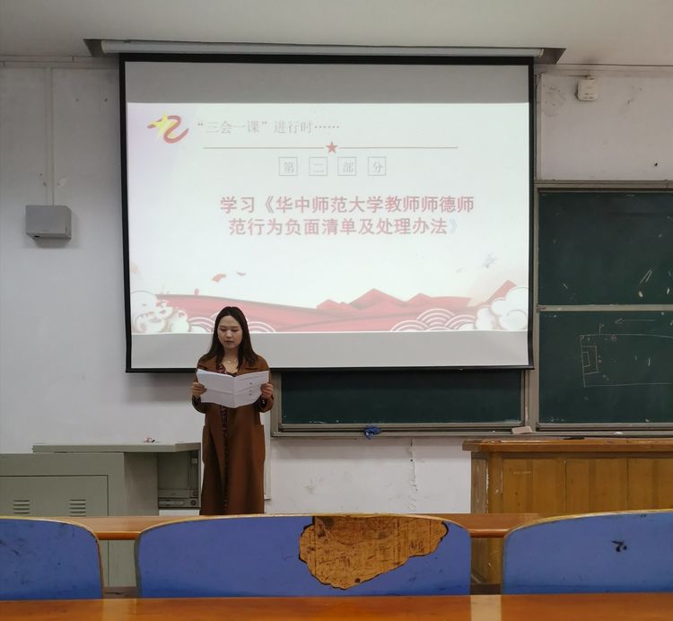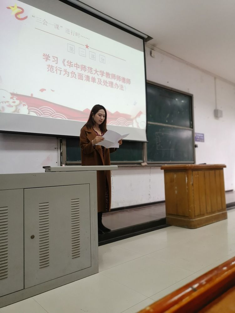 随后,由第二党支部的宣传委员蔡佳同志组织全体教职工学习文件《华中师范大学教师师德师范行为负面清单及处理办法》。会议上,老师们认真领悟文件精神,并仔细撰写着阅读笔记。