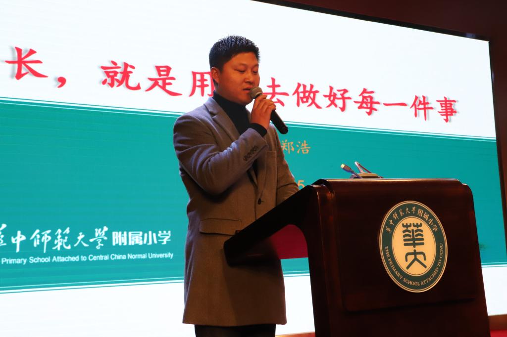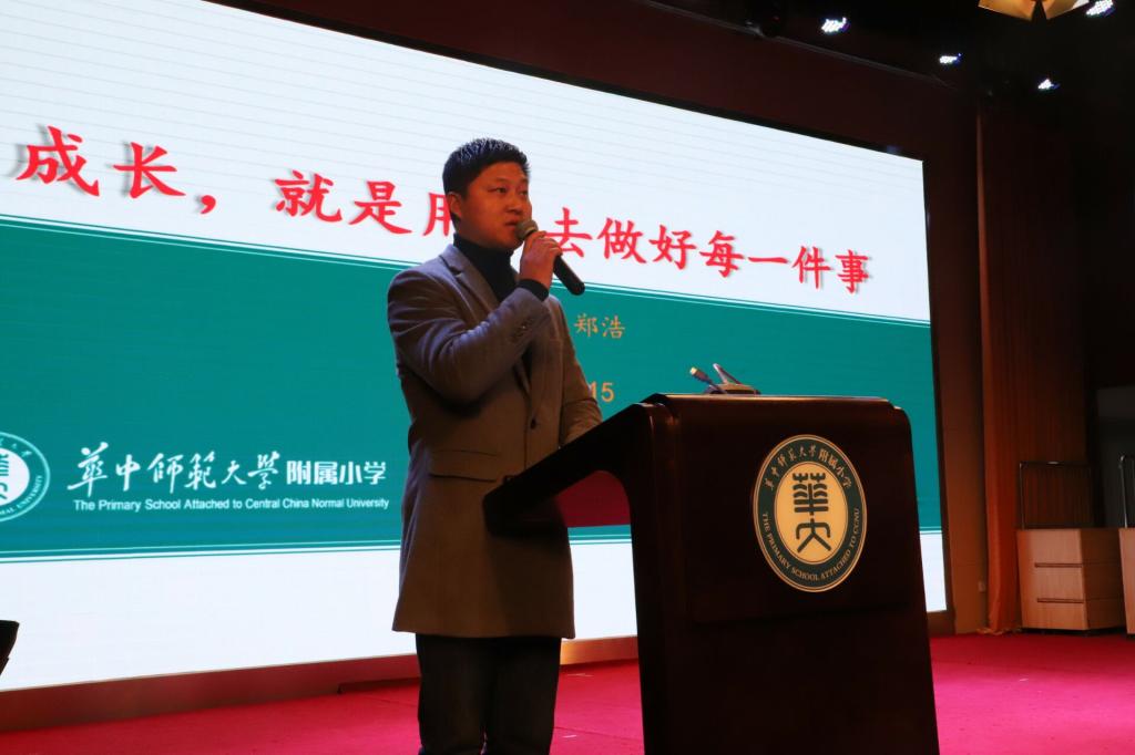 附小优秀体育教师、武汉市体育优质课一等奖获得者郑浩老师发表获奖感言。他感叹道,成长就是用心去做好每一件事。