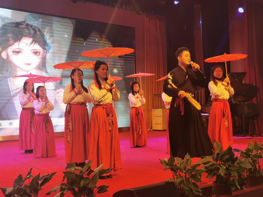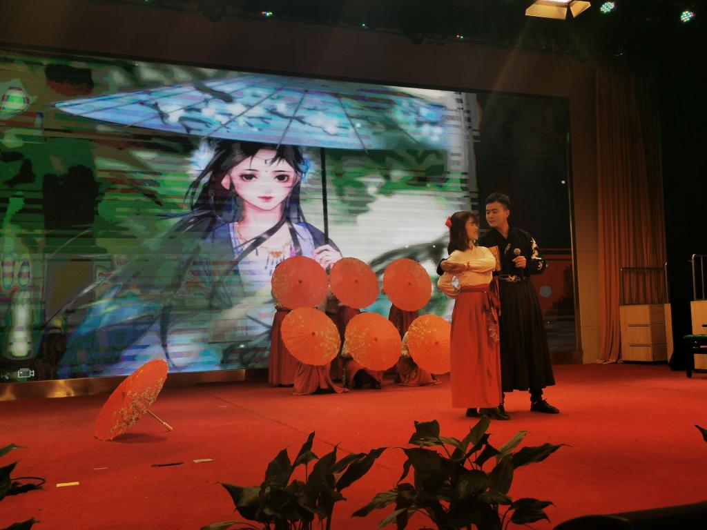 王颖、夏宇等南湖校区二年级组老师,为在场老师们带来一段意境优美的歌伴古风伞舞《烟雨行舟》。红油伞,半髻头,轻纱曼舞,袅袅婷婷,烟雨绸缪。