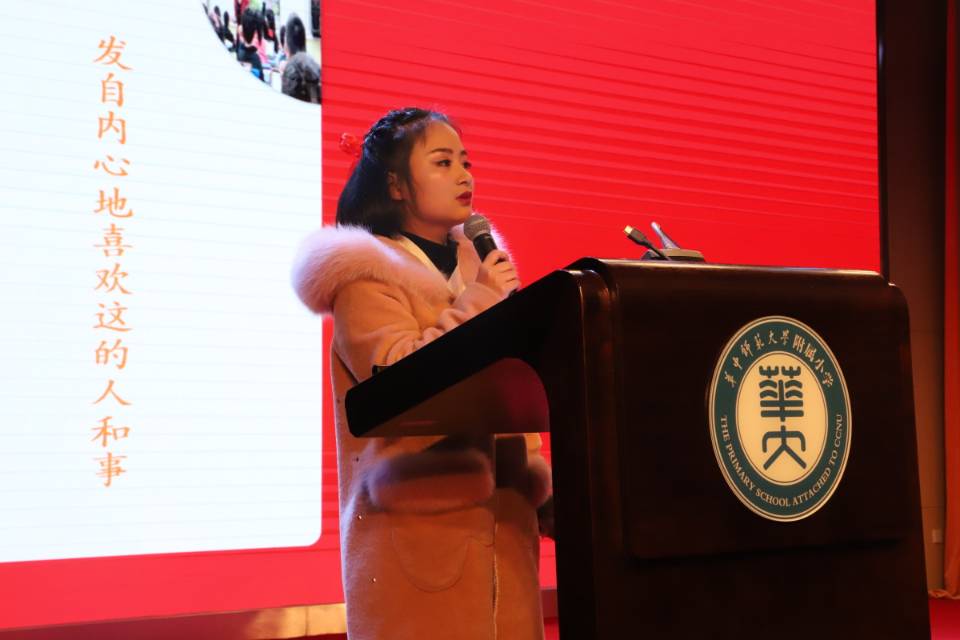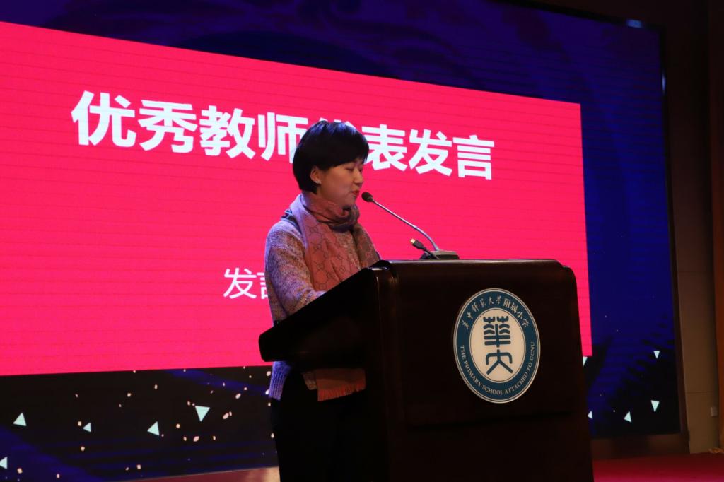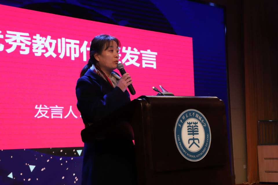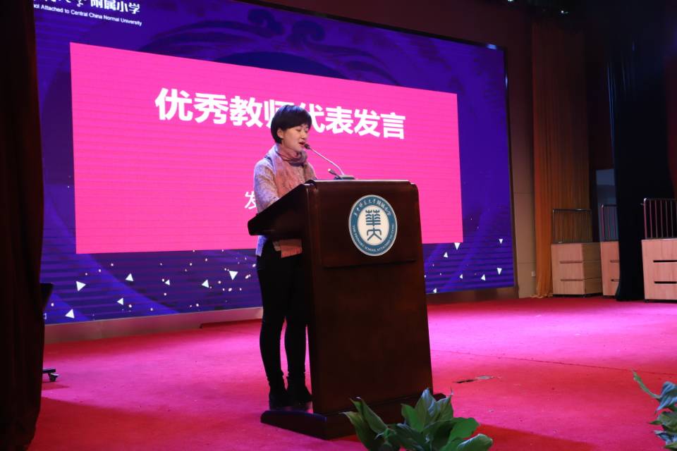 洪山区十佳辅导员韩颖老师、洪山区十佳班主任曹兰老师、武汉市语文优质课获奖者廖蓉老师、武汉市体育优质课获奖者郑浩老师、洪山区教学能手代表杨武林老师,以及华师附小新进教师代表张会林老师,作为附小优秀教师代表依次上台发言。