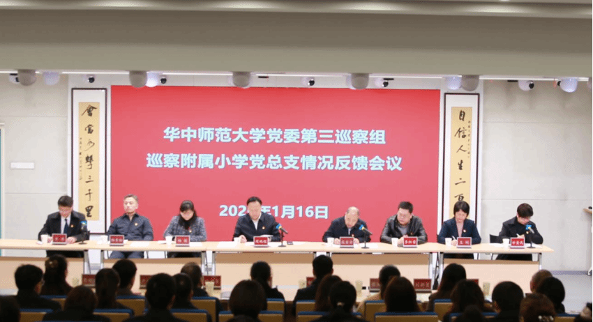(通讯员:唐从义)根据华中师范大学(以下简称“华中师大”)党委统一部署,1月16日,华中师大党委第三巡察组向附属小学党总支反馈了巡察情况。巡察组组长寇富安分别向附小党总支书记、校长宋涛和附小领导班子反馈了巡察情况。华中师大党委常委、副校长周鹏程出席会议并讲话。宋涛在反馈大会上作表态发言。附小副校长甘爱民主持会议。