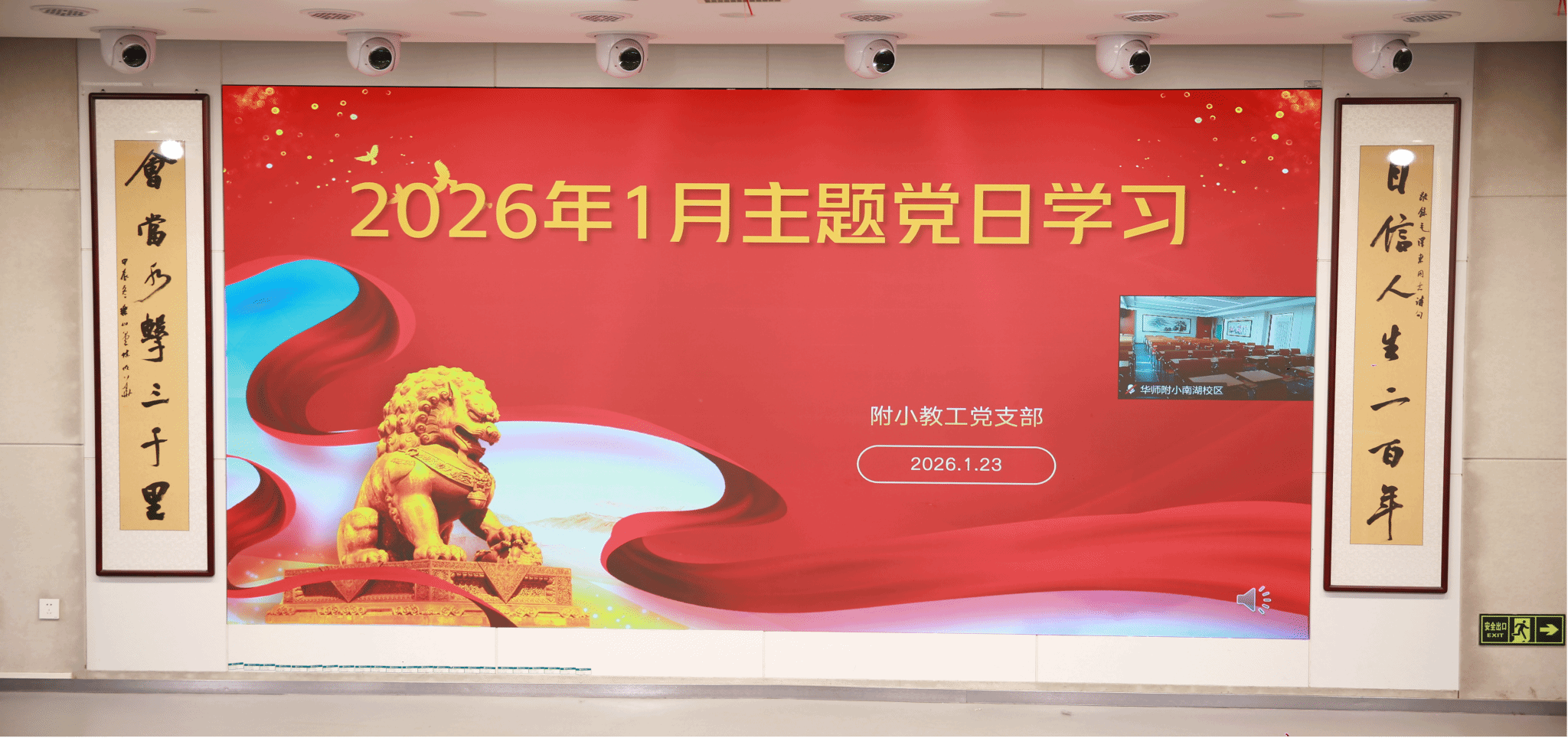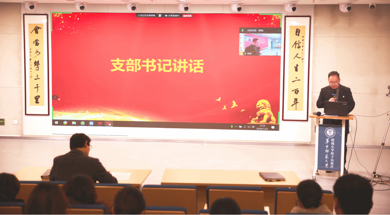 岁末之际进行总结,旨在谋划新的发展篇章;开展理论学习,能够巩固基础、增强实力。2026 年 1 月 23 日下午,华中师范大学附属小学两个校区的教工党支部采用“现场 + 线上”相结合的方式,组织开展了蛇年的最后一次主题党日活动。桂子山校区的党员教师在阶梯教室集中学习,南湖校区的党员教师线上同步参与。活动跨越校区界限、突破时空限制,以规范的组织程序、深入的学习研讨和务实的工作部署,圆满完成了年度党建工作总结,为“十五五”规划开局之年的教育工作奠定了坚实的思想基础。