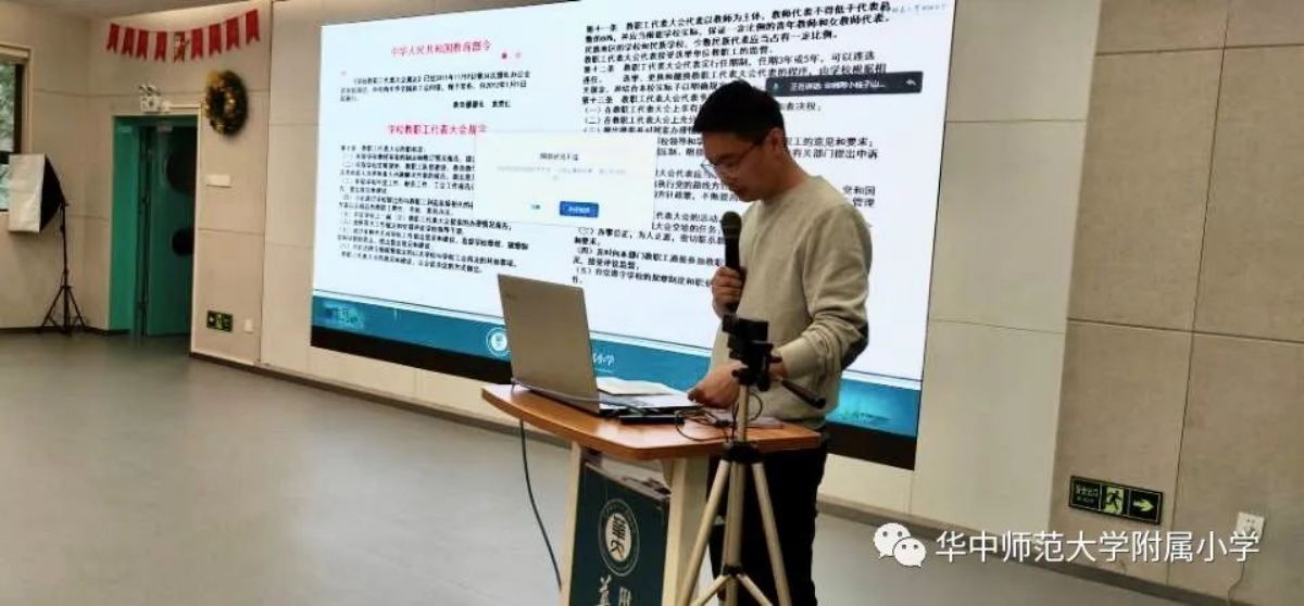 5月20日下午16:20,华中师范大学附属小学工会换届选举大会在学校四楼阶梯教室如期举行。华师附小桂子山校区及南湖校区全体教职工以网络连线的方式齐聚一堂,会议在庄严的国歌声中拉开序幕。