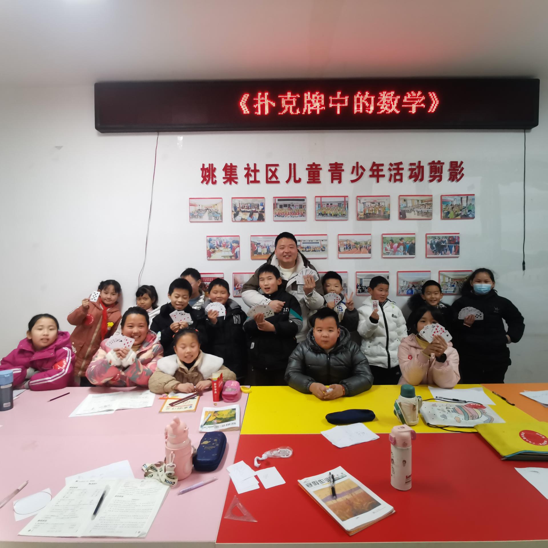 宋书迷作为一名数学老师不忘自己的老本行,将他的研究成果带到了黄陂区天河街道社区和姚家集社区。为社区的孩子们带来了一节趣味数学课——“扑克牌中的数学”。扑克本是娱乐物,实与数学大渊缘。尚有魔术奇幻秀,寓趣寓乐寓学习。宋老师从扑克牌入手,带领孩子们共同探秘扑克牌中的数学奥秘。孩子们在玩中学,在学中玩,一节课下来意犹未尽。