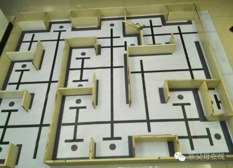 回到酒店,我和爸爸马上在酒店电梯厅旁边的空地上铺地图,拿出机器人,分析“巡线迷宫”比赛中出现的问题。爸爸说:“是不是巡线的光感与车轴之间少留了一格?”我拿着机器人,一看,果然把光感往后多拼了一格!