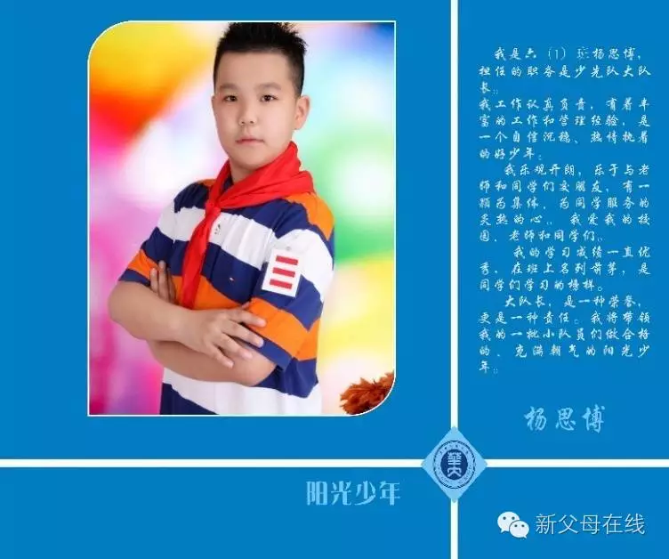 自信的脸庞,明亮的双眼,鲜艳的红领巾,醒目的三道杠,在华师附小六(1)班的班级文化墙上,赫然映入眼帘的就是这样一位“阳光少年”,他是学校新任大队部大队长,先后获校“助人好少年”、“书香少年”、“好习惯形象大使”等称号,年年被评为校“优秀学生”、区“优秀少先队员”、“少先队优秀大队委”,去年还被评为武汉市“优秀学生”。他就是华师附小六一班的杨思博同学。