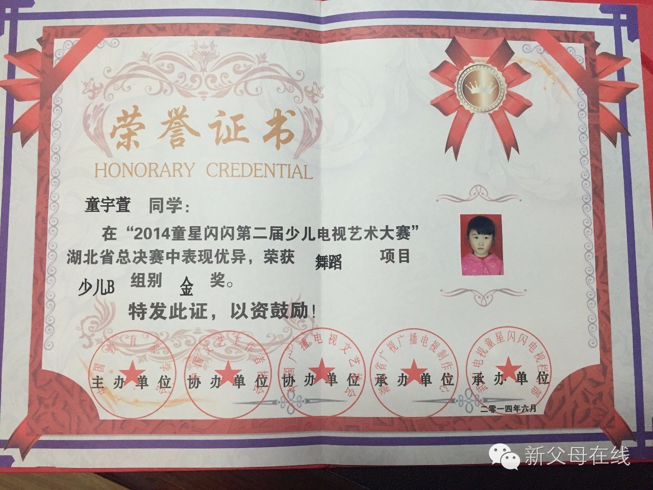 她5岁开始学习中国舞,至今已有5年的舞蹈学习历史。舞蹈老师对她的身体条件和表现力度赞不绝口,推荐她参加湖北省2014年童星闪闪第二届少儿电视艺术大赛,经过精心准备、刻苦练习,她在总决赛中以一支爵士舞《大眼睛》获得了评委老师的高度认可,荣获舞蹈项目少儿B组别金奖。