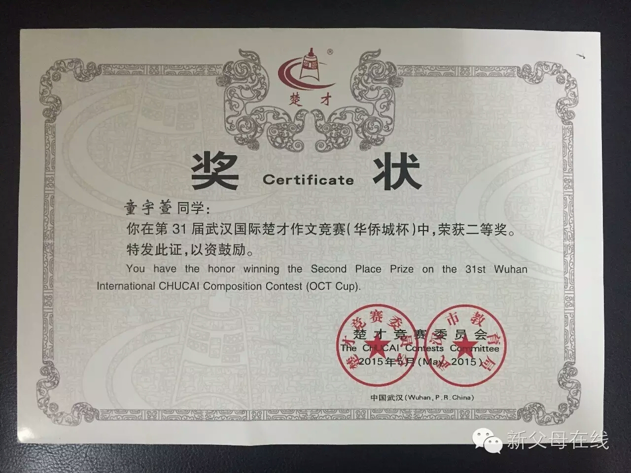 得益于良好的阅读习惯,她具有较强的文字表达能力,作文写得又快又好,经常被老师当作范文在班上点评;三年级时开始在写作方面展露出“小荷尖尖角”:2015年5月,在第31届武汉国际楚才作文竞赛(华侨城杯)中荣获二等奖,并在华师附小举办的作文学科竞赛中荣获三等奖;2016年3月,在华师妙笔作文总部举办的楚才杯作文预选赛中荣获一等奖。