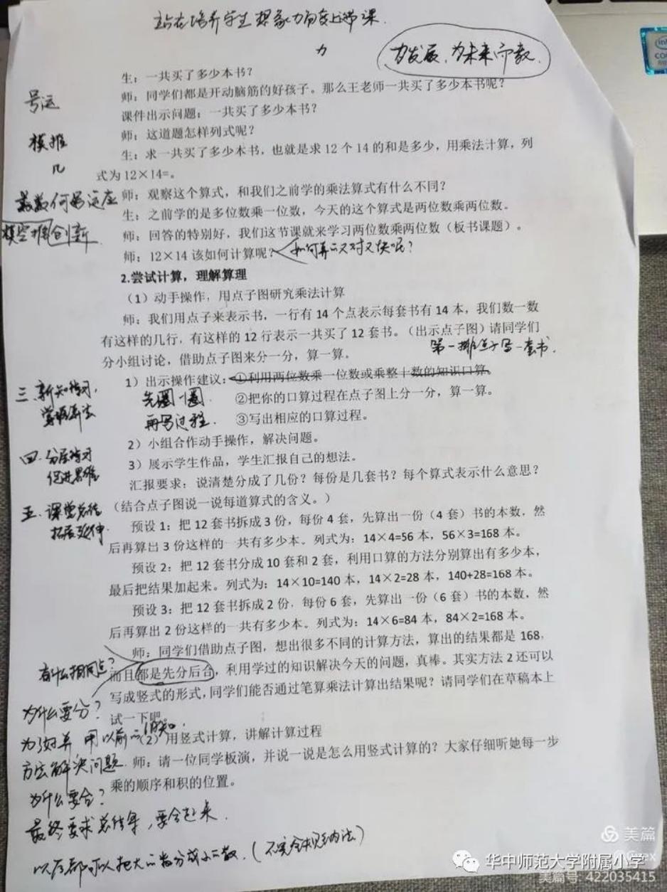 接下来,各年级组老师对付美娇老师此课的教学设计进行研讨。四年级数学组备课组长孙迎萍主要根据以往的教学经验与公开课执教经验,分享了教学过程中学生在利用点子图学习时可能出现的疑问与问题以及如何引导学生思考;四年级数学组老师邱梦、夏宇从如何解决12×14的具体问题上阐述了自己的教学想法;二年级数学组备课组长宋荷对“如何更好地帮助学生由具体书本抽象为点子图”提出了思考与想法;一年级数学组备课组长余梦萍就付美娇老师的教学设计,主要从点子图如何展示、联系口算乘法教学和在教学中增加数学文化三个方面发表了自己的观点;三年级数学组老师宋书迷针对老师们的分享与问题进行了简短的总结,并阐述了三年级数学组前期对此课的研讨过程以及遇到的一些疑问。